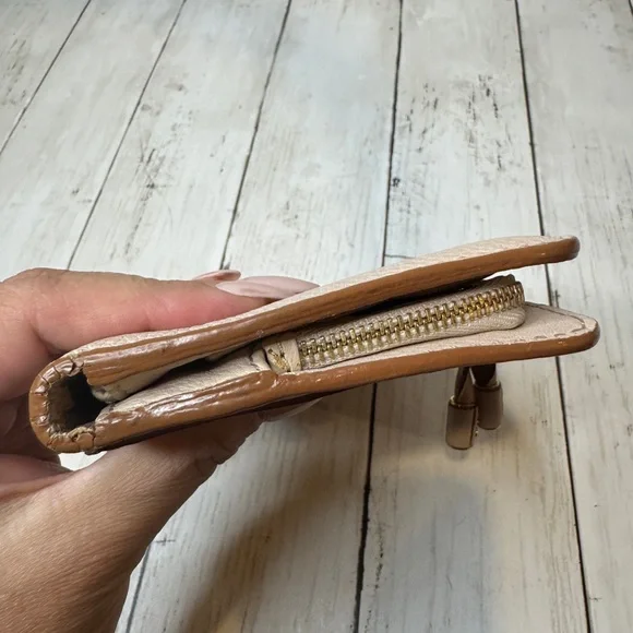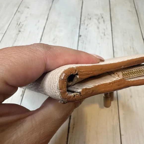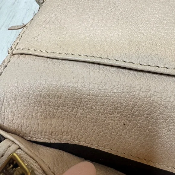 Elevate your style with this beige leather bag. Perfect for any occasion, this elegant accessory adds a touch of sophistication to your ensemble.Edges good. One corner cracked....