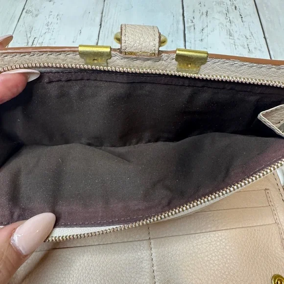 Elevate your style with this beige leather bag. Perfect for any occasion, this elegant accessory adds a touch of sophistication to your ensemble.Edges good. One corner cracked. One zipper is missing its leather pull. No box.