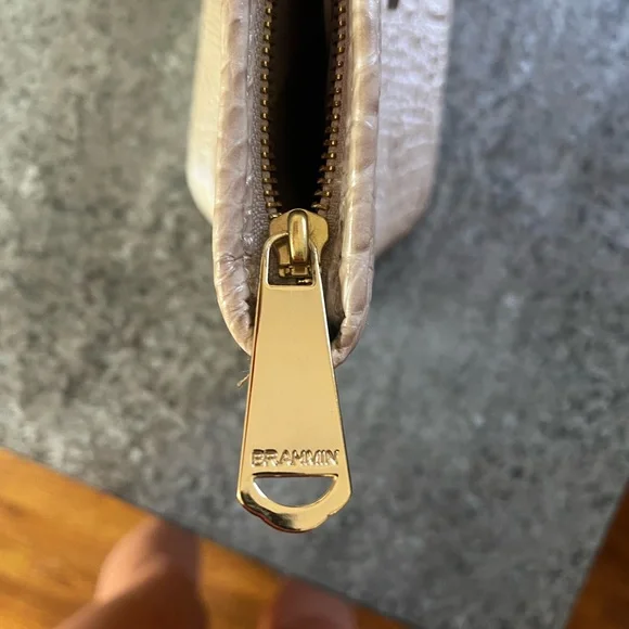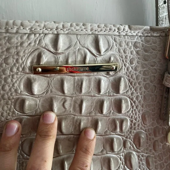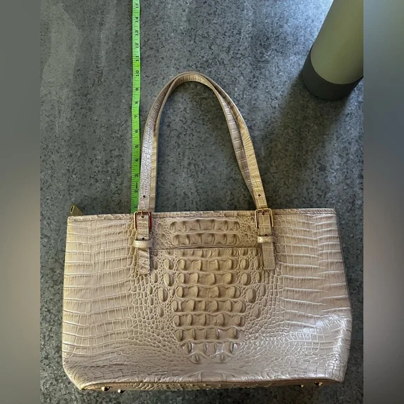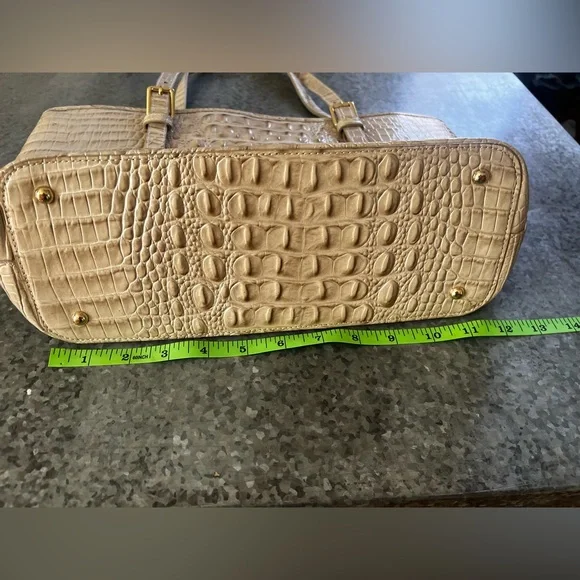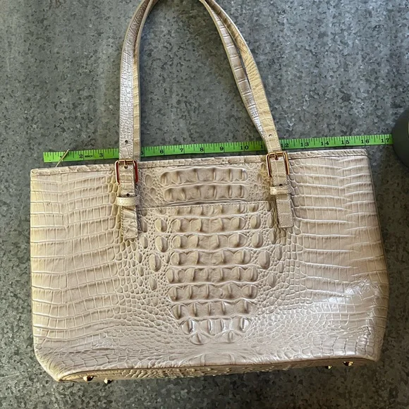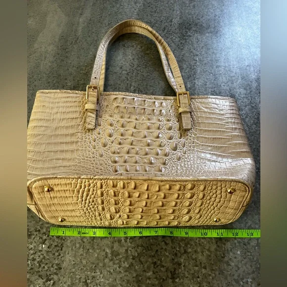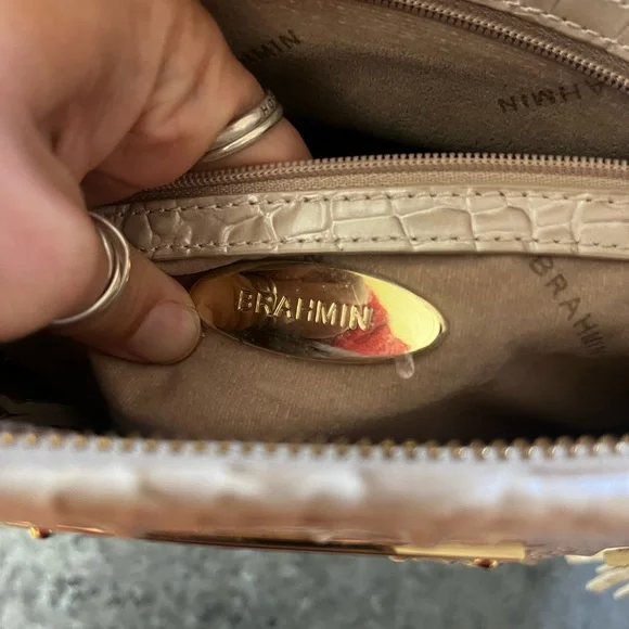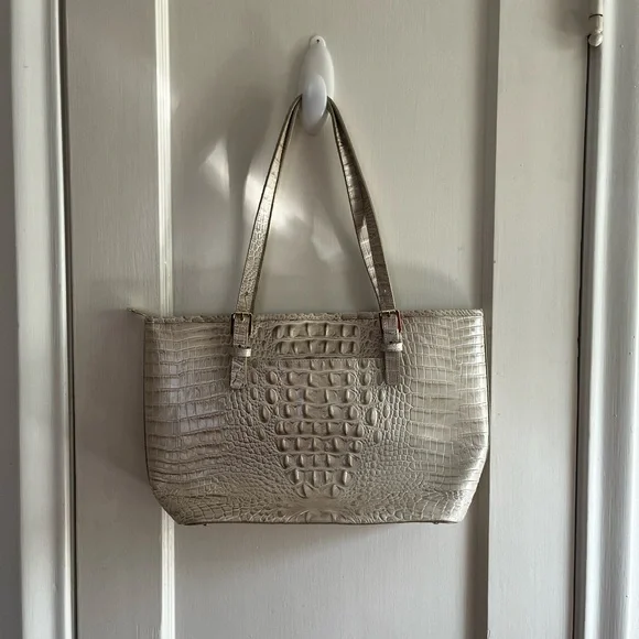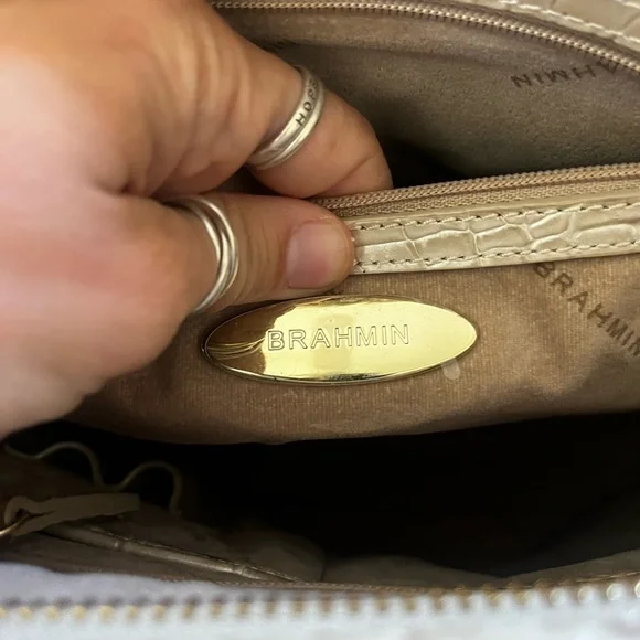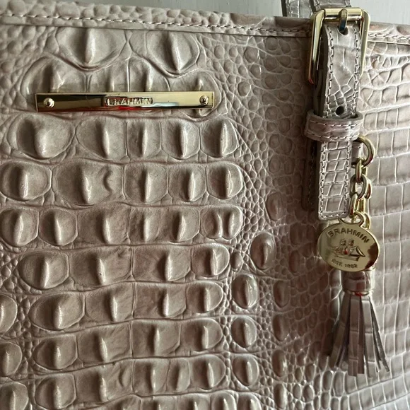 Brahmin medium Asher tote.Structured style that is polished and practical featuring their signature, organizational detail details . Color is a blend of beige tan and cream with a shimmery pearl finish . Genuine croc embossed leather Features double adjustable handlesBack slide in pocket A footed bottom An interior organizer pocket Dimensions are16” W x 10.25” H 5” DThis bag is an excellent condition. Only used a handful of times. There is a very small scratch on the gold exterior plated Brahmin logo. Other than that it’s in excellent condition.