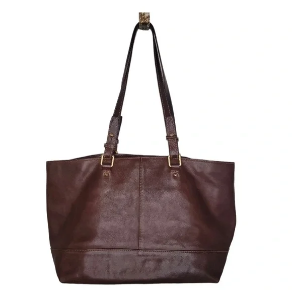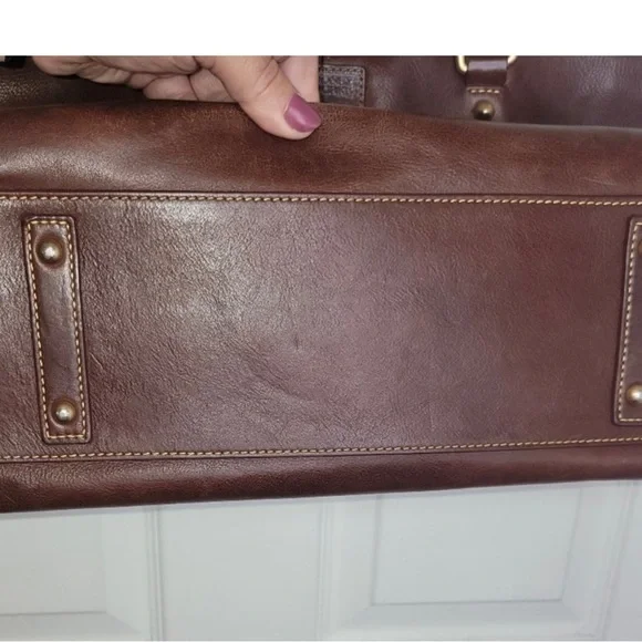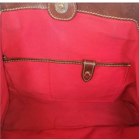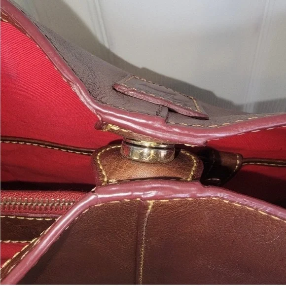 Beautiful, clean buttery, chocolate brown leather with power red interior preowned looks great blind ample storage space snap closure adjustable strap. See pictures for dimensions and additional description. Questions? Leave a comment below!