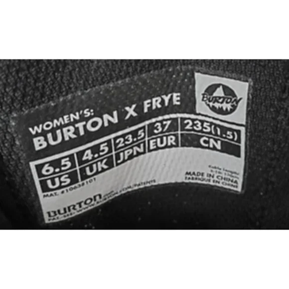 ***** PLEASE BUY WITH CONFIDENCE! HAS GRANTED US AMBASSADOR STATUS TO RECOGNIZE OUR CONSISTENTLY EXCELLENT QUALITY & CUSTOMER SERVICE *****These are brand new Burton Burton x Frye boa snowboard boots!Finally, you don’t have to leave your style-savvy wardrobe at home when you hit the mountain. This Frye collaboration from Burton delivers the same all mountain performance you’ve come to expect from Burton, and the high quality leather you love in your Frye boots. Get some tech with your country with plush U.S.A. made Horween leather paired with the new-age Coiler BOA system for the ultimate in custom fit in a snap. A soft flex makes it perfect for all skill levels, intermediate and beginners alike. Whether you want the flexibility of a park boot or a resort boot this boot delivers!Leather Upper With Southwest Inspired DesignSizes: 5 and 6.5 (other sizes a re sold out)Women”s Specific True Fit DesignLacing: Boa Coiler & Closure System Powered by NEW Burton Exclusive New England RopesLiner: Imprint 3 Liner with DRYRIDE Heat Cycle Lining, NEW X-Up Cuff, Plush Cuff 1.0, and Rad PadCushioning: Lightweight, Low-Profile EST Outsole with B3 Gel and Sleeping Bag Reflective FoilFlex and Response: Soft-Flexing Shell Materials and 1:1 Soft Flex TongueComfort: Snow-Proof Internal Gusset flat rate shipping of $7.95 makes these boots a great deal (normally it would be $20 or more to ship boots like these due to the weight).