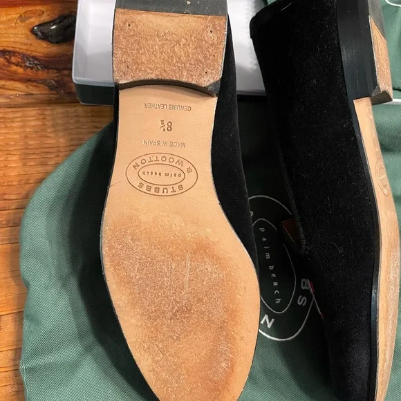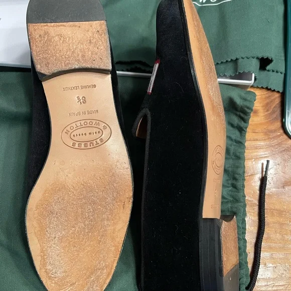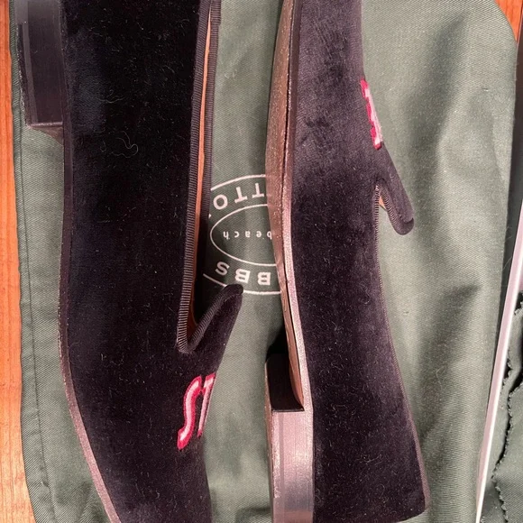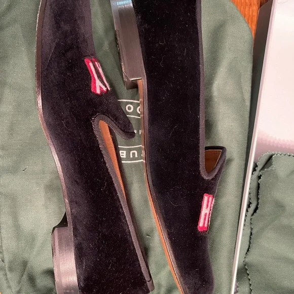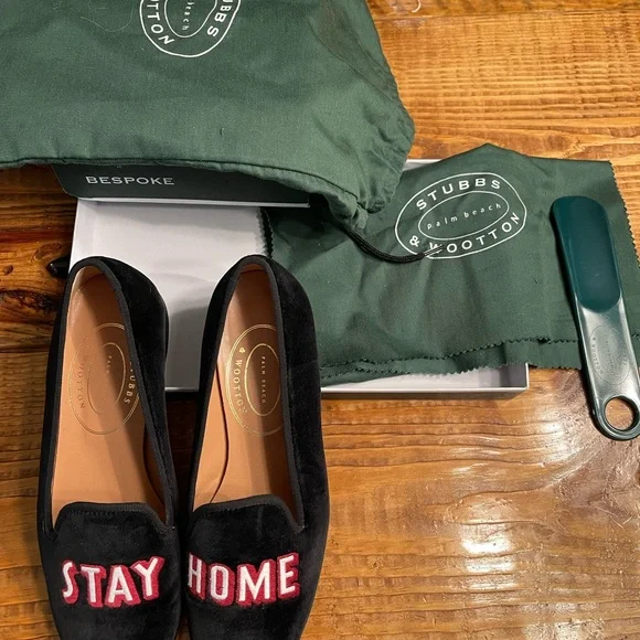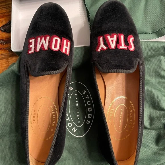 These luxurious Stubbs & Wootton black velvet loafers are from a limited run bespoke collection circa 2020. They feature bold embroidery with the message “STAY HOME.” Very cheeky and playful. Perfect for a sophisticated look no matter the season. These loafers were worn once and are in excellent pre-owned condition. They fit TTS and are extremely comfortable. Make me an offer! Comes with all accessories shown.