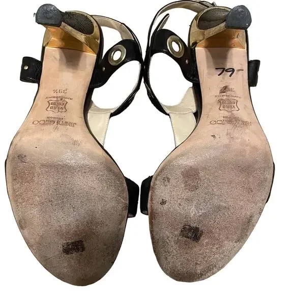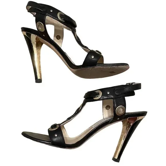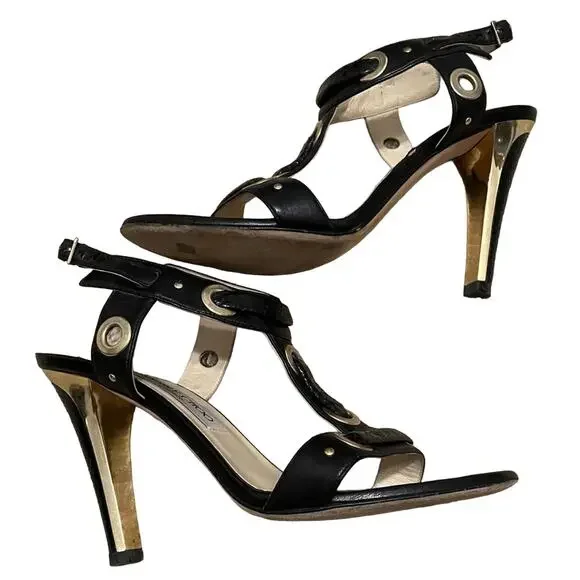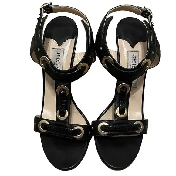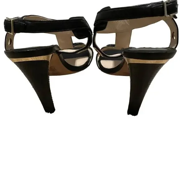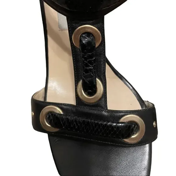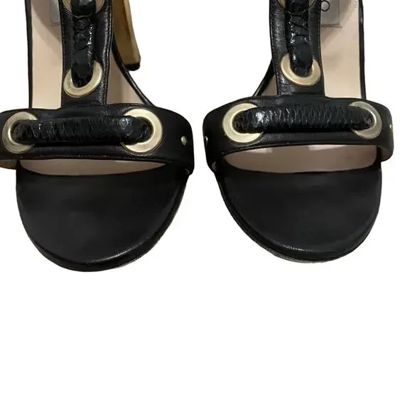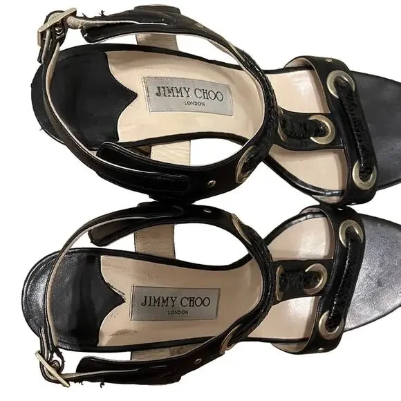 These elegant black Jimmy Choo leather & snake ~4 inch high heel sandals with gold detailing are good looking! The only reason I’m letting them go is they are a bit too small...