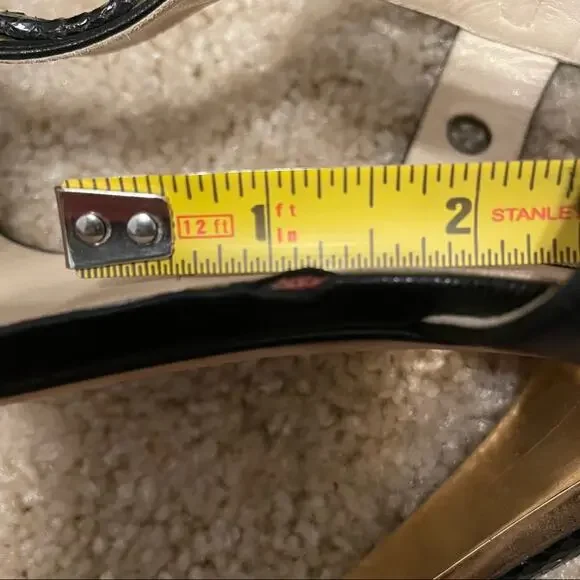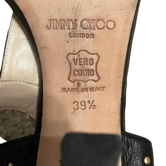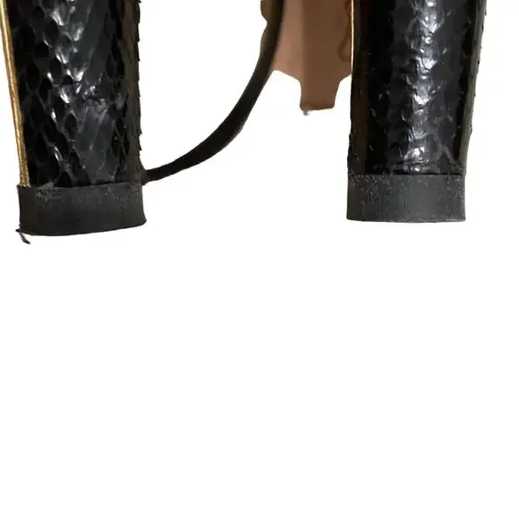 These elegant black Jimmy Choo leather & snake ~4 inch high heel sandals with gold detailing are good looking! The only reason I’m letting them go is they are a bit too small for me. They are in great condition. Size 39.5. Made in Italy. There is a small cut on the side of the left shoe that’s about .25 inch long. I received compliments on them every time I wore them.The items I sell are from my own wardrobe, which is smoke-free and pet-free, so my items are friendly for those with allergies.