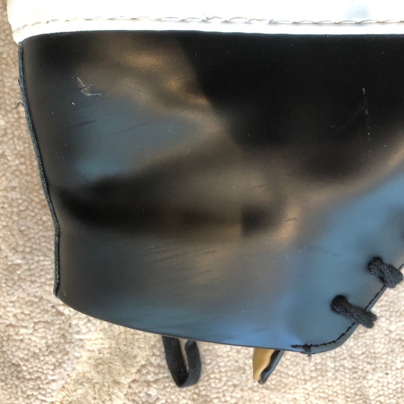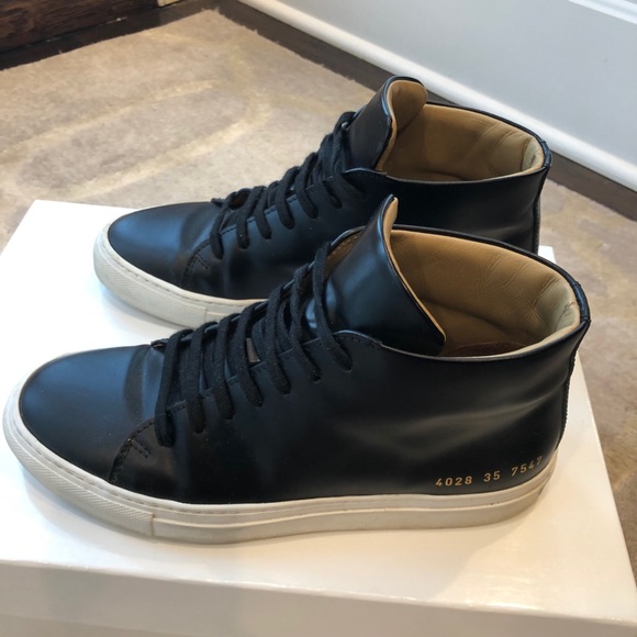 Common Projects Original Achilles Mid-Top Leather Trainers in Black. Crafted of black spazzolato leather. 1.25/30mm midsole (approximately). Rounded toe. Padded tongue and collar. Signature metallic gold-debossed numbers at heel. Black midsole. White flat laces. Lace-up style. Lined with smooth leather. Rubber sole. Minor scratches shown in pics. Size 5 but fits more like 5.5 or 6 if you don’t tie the laces tight. Comes with box, dustbag and an extra set of laces.