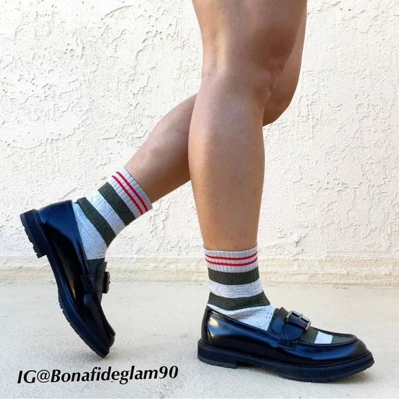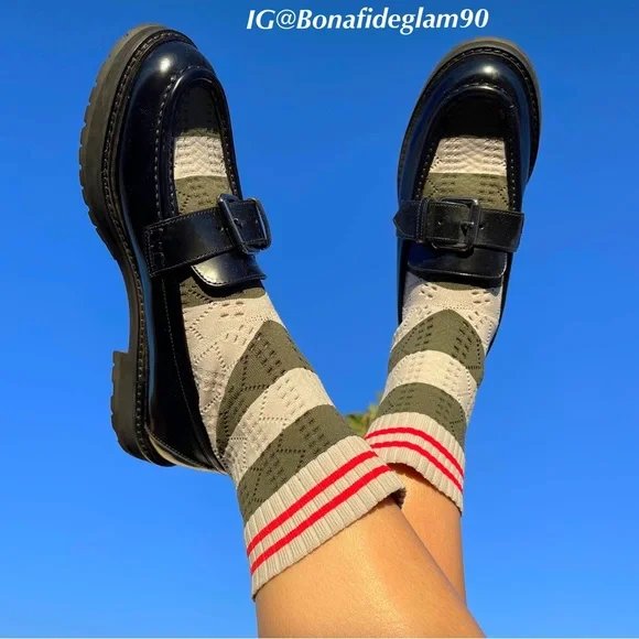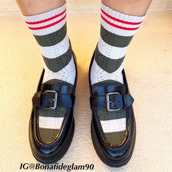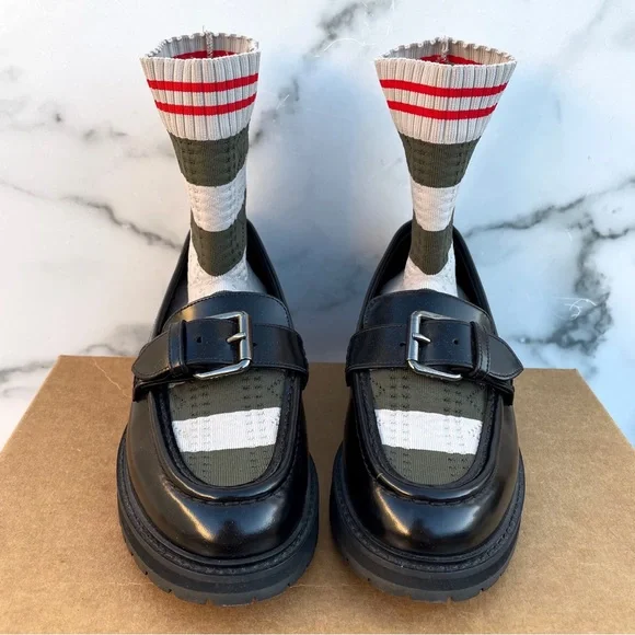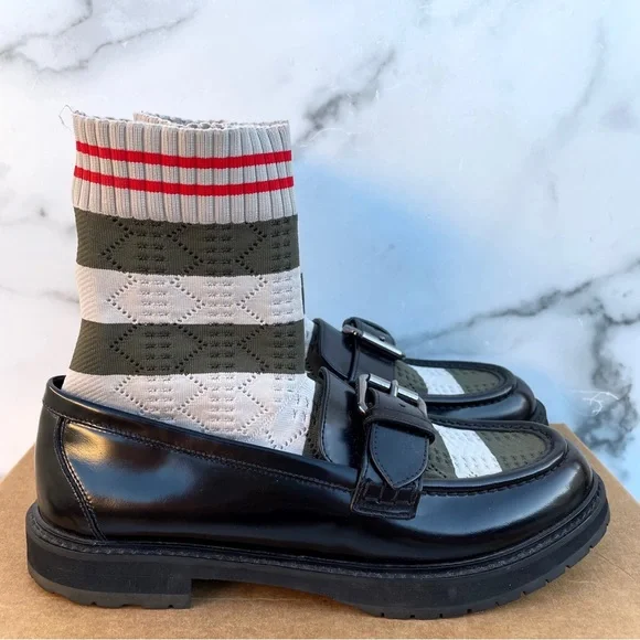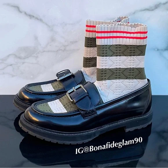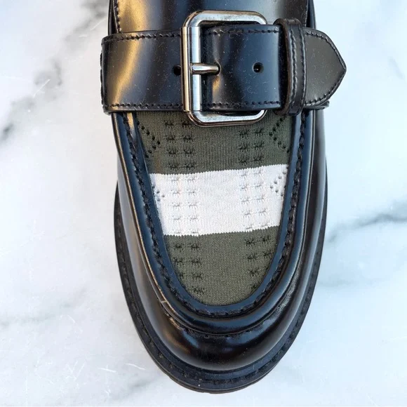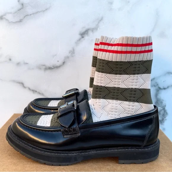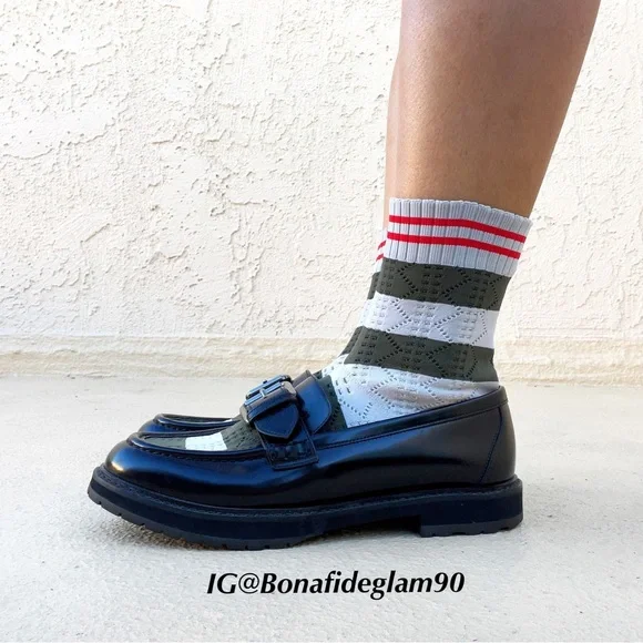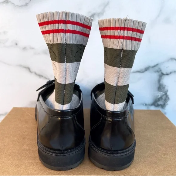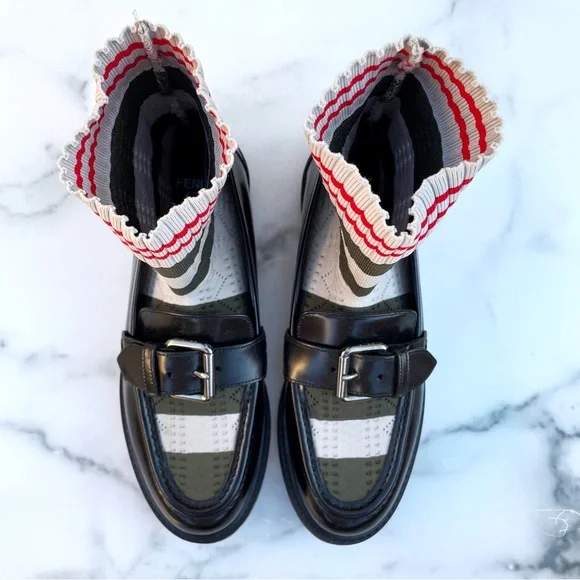 100% authentic Fendi black patent leather Scuba sock loafers, size 36.5. Like new condition, slight wear on soles from being tried on. No box or dust bag. Retail $1,050.Patent leather loafers in black. Round moc toe. Knit sock-style underlay striped in brown, navy, and green at vamp and collar. Pin buckle strap at vamp. Treaded rubber sole in black. Silver-tone hardware. Tonal stitching.