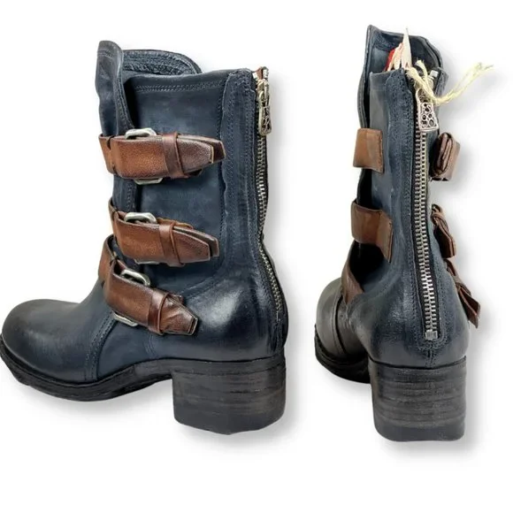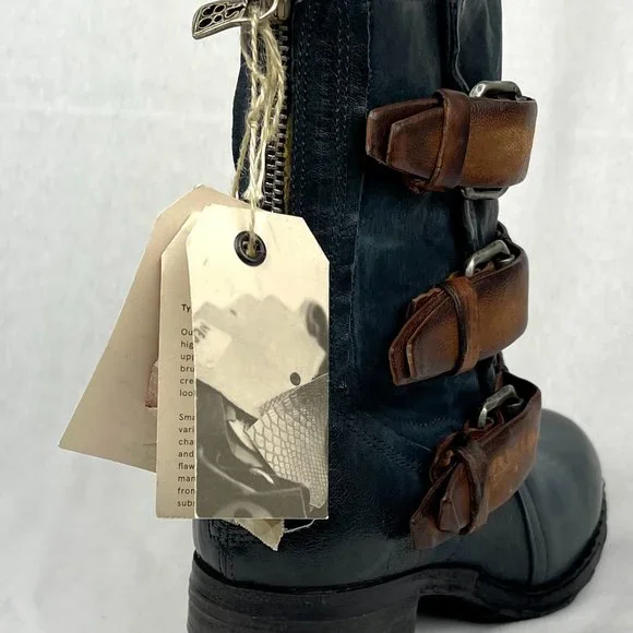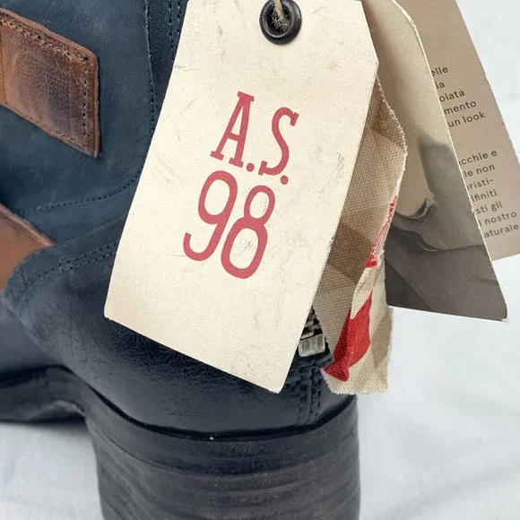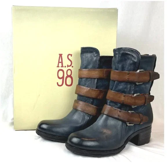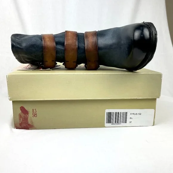 A.S.98 Blue Leather Boot with contrast Brown Buckled Straps. New in original box with tags and wrap cloth, never worn, no defects, very rare.This signature quality boot is a must-have. A very versatile style you can wear in all seasons and for years to come. A.S.98 boots are beautiful, constructed by hand in a small family factory with leather that comes from historical tanneries in Italy. Artisans hand sand, brush and wash the leather to create the rough edge and imperfections that make these boots genuine orginals of A.S.98.-New in Box with tags and wrap cloth-Rare, early A.S.98 Mid-Calf Boot-Size EU 37 US 6.5 to 7-Leather upper, lining & interior-Rubber man-made destressed textured sole-Heel 1 3/4"-Sole Pad 0.5"-Shaft back 9" front 10"-ConfortableSmoke free, pet freeI take the time to research each listing and price each according to vaue based on condition, rarity and comps. Posh takes 20% commision so I rarely send discount offers, and do not entertain low ball offers, trades or models.I ship safely and quickyListing is avaliable until marked soldThank You for stopping by my listingOXOX
