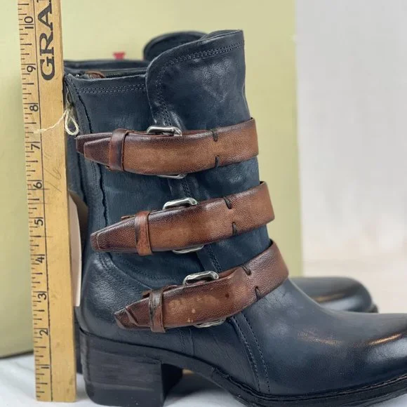 A.S.98 Blue Leather Mid-Calf Boot with Brown Buckled Straps EU 37, New WT