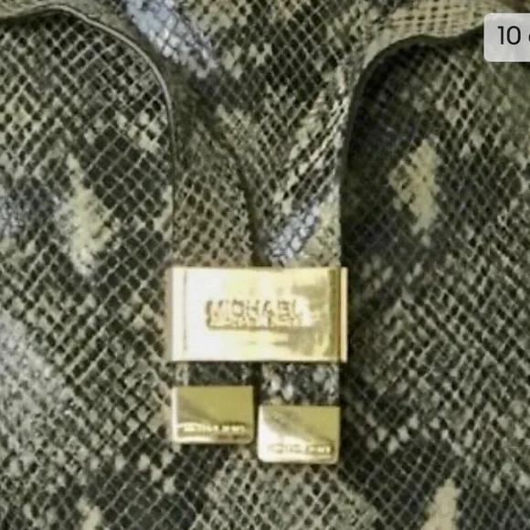 Michael Kors Faux Snakeskin Designer Satchel Handbag.Dark and light gray purse. Embossed and fashioned to simulate exotic reptile skin.Large spacious, substantial handbag. Heavy weight gold tone hardware.Three interior sections, including a zipper on the center section. Two exterior side pockets, each with a snap.16 inches wide x 11 inches high.5 inches deep, measured at the bottom.Fair to good pre-owned condition.There are several small rough scuffed patches in the light gray areas throughout the exterior of the purse. This wear is due to age and use. You can feel the abrasions, but outside observers will never notice them because they´re perfectly camouflaged within the reptile pattern. Also, there´s minor wear such as very small scratches on the metal. Otherwise, interior and exterior are clean and the structure is sound and very usable.Please supersize photos for condition details.