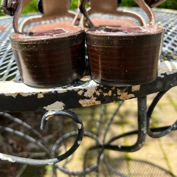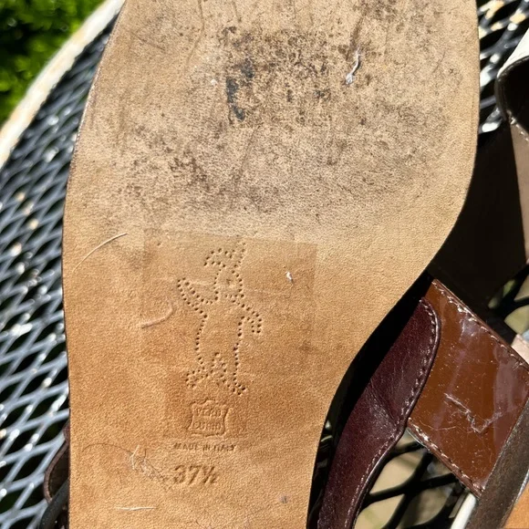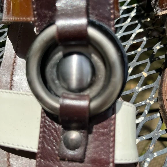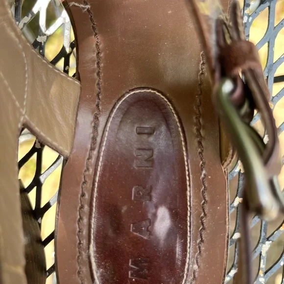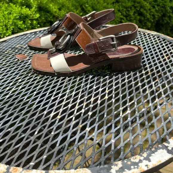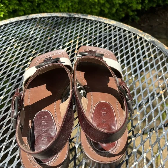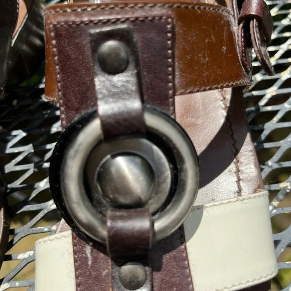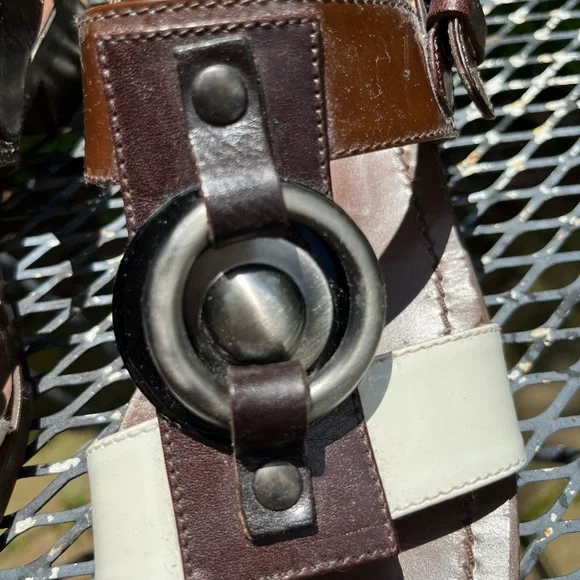 Marni brown and white sling back sandals with a metal embellishment and a metal ring for a edgy look. It’s a great looking Richy flare sandal!Leather bottoms as well.