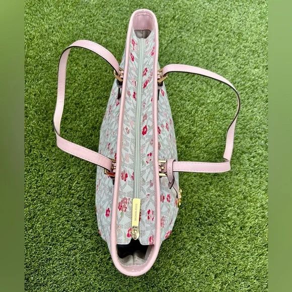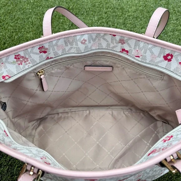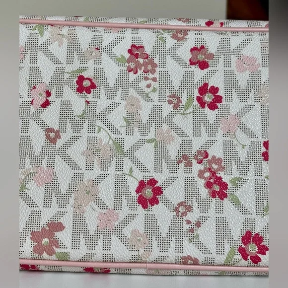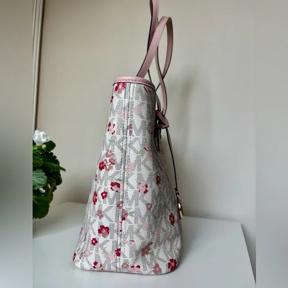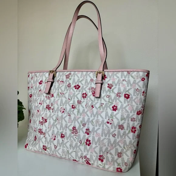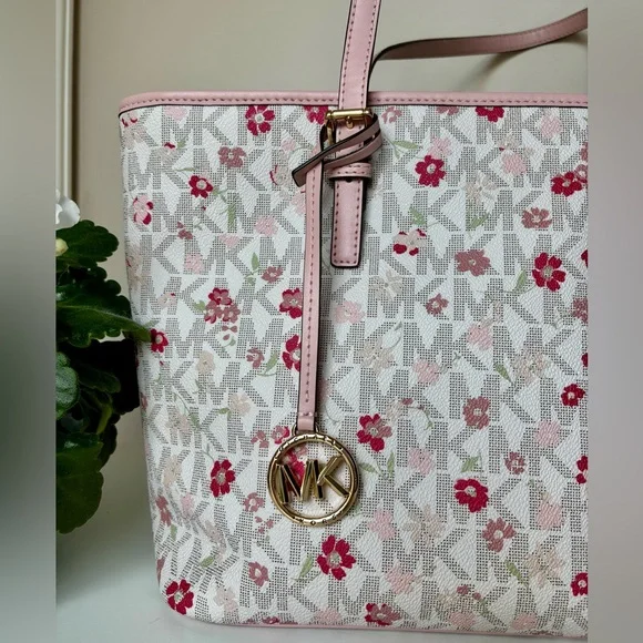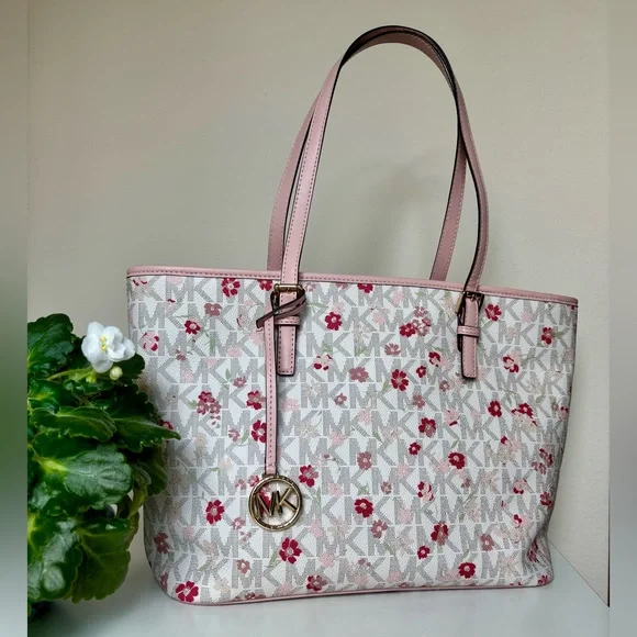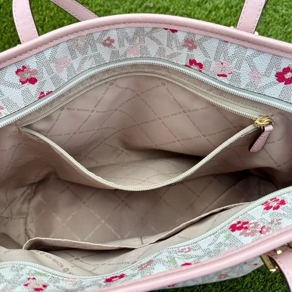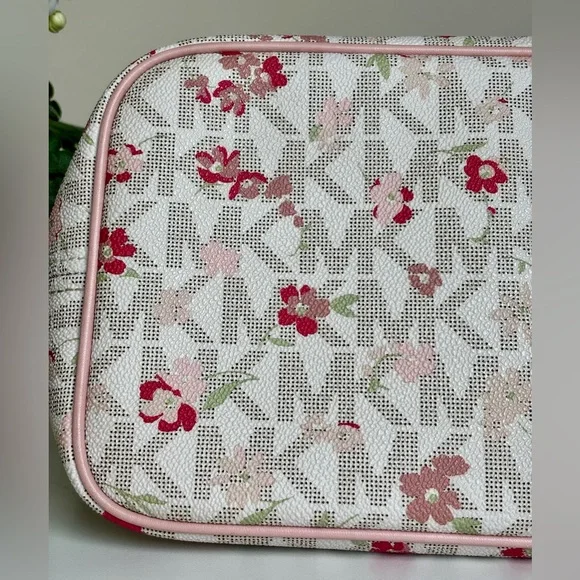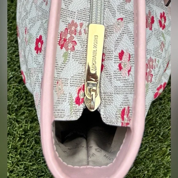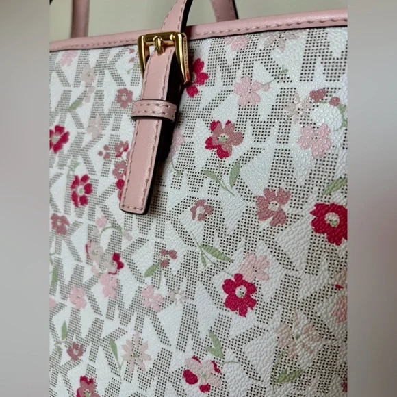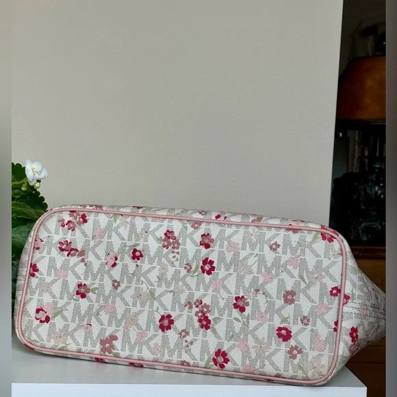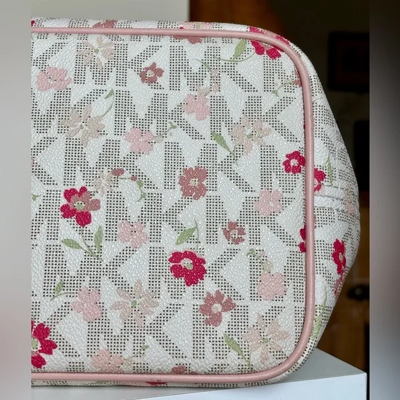 This Michael Kors zippered purse tote bag features a charming pink floral-motif layered on MK logo-print canvas with a white background and accented with a soft pink leather trim...