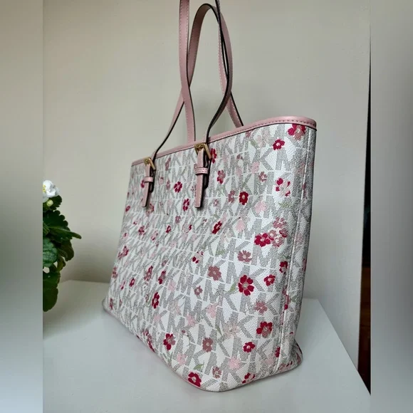 This Michael Kors zippered purse tote bag features a charming pink floral-motif layered on MK logo-print canvas with a white background and accented with a soft pink leather trim and handles. Its structured design ensures durability and style, making it a perfect accessory for any occasion. This bag is in NEW CONDITION! • Zippered Tote bag• Logo-print canvas• 90% coated canvas/10% polyester• Gold-tone hardware• 16"W X 10.25"H X 5.75”D• Handle drop: 10"• Interior details: 2 front slip pockets, back zip pocket• Lining: 100% polyester• Imported