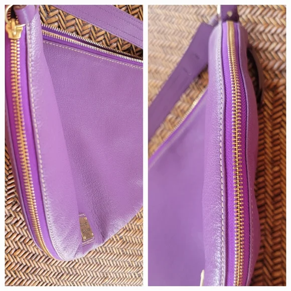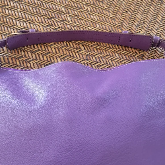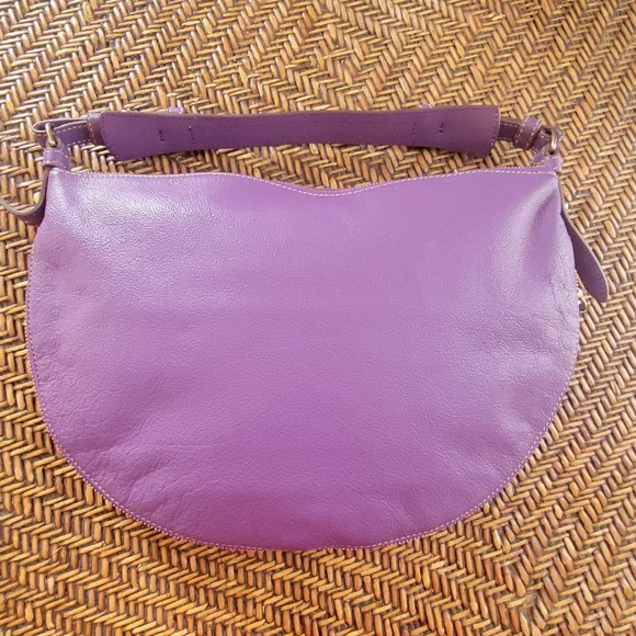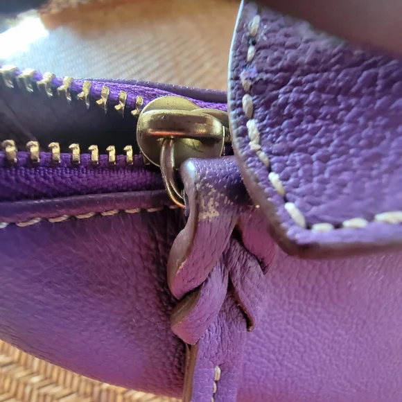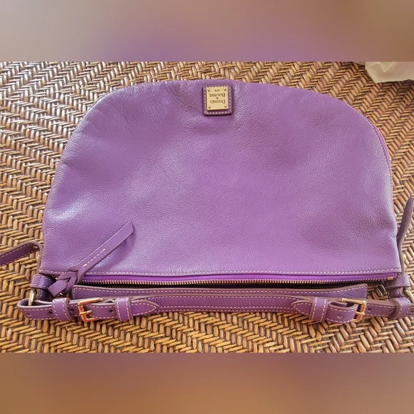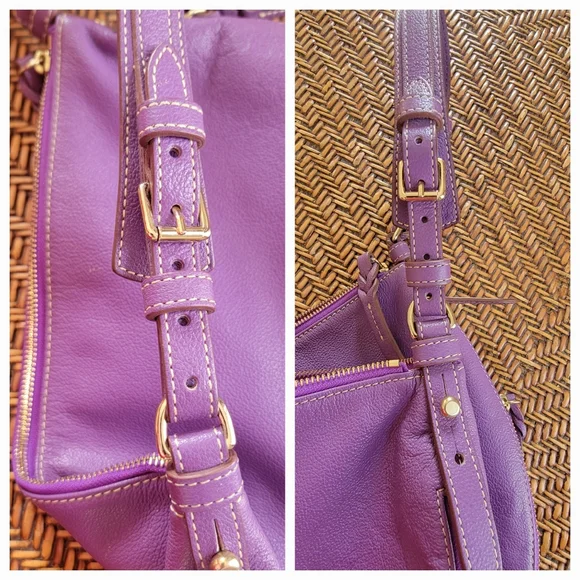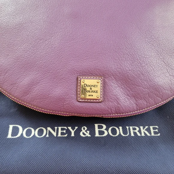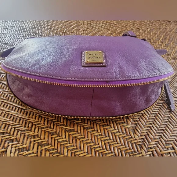 Elevate your style with this classicDooney & Bourke pebbled leather hobo shoulder bag. Half moon themed designZip around expansion along bottom for more interior space Gold hardware accentsAdjustable shoulder strap Leather zipper pullsClean pink/white fabric InteriorZippered pocketOpen pouchLeather key leash14" x 10"Pictures are part of descriptionTiny light rub on top zipper pullPurchased new. I maybe carried this bag 3x.Excellent conditiondust bag included
