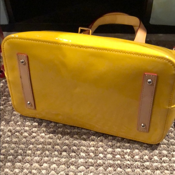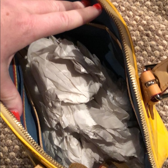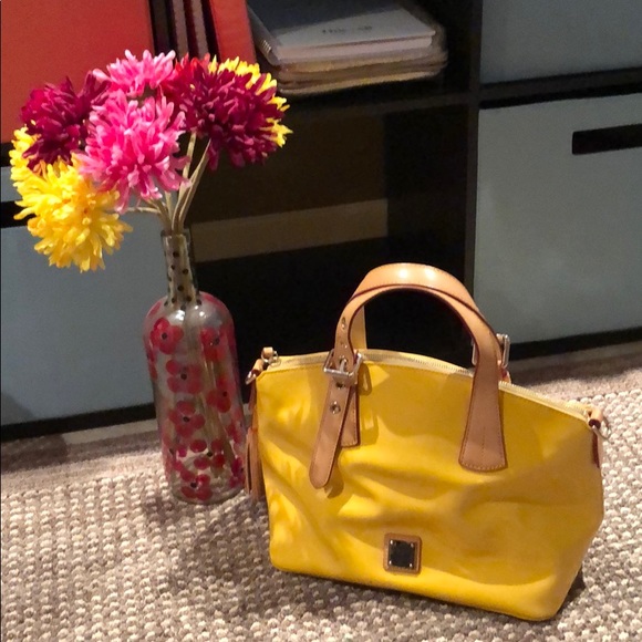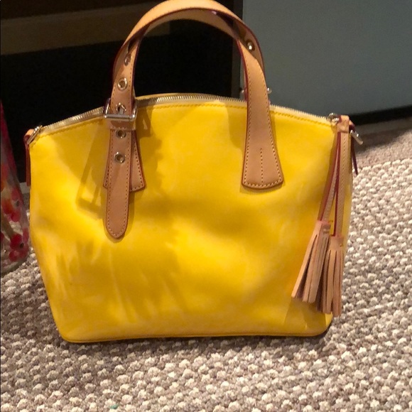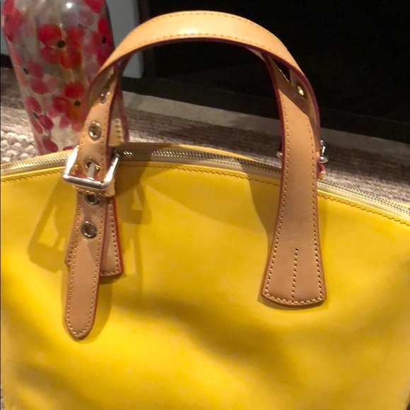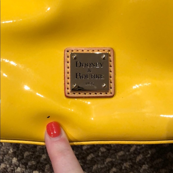 Shiny bright Yellow Dooney & Bourke bag. Fun way to accent an outfit or make a statement.I like to call this my rain bag bc it’s shiny smooth like a raincoat or rain boots...
