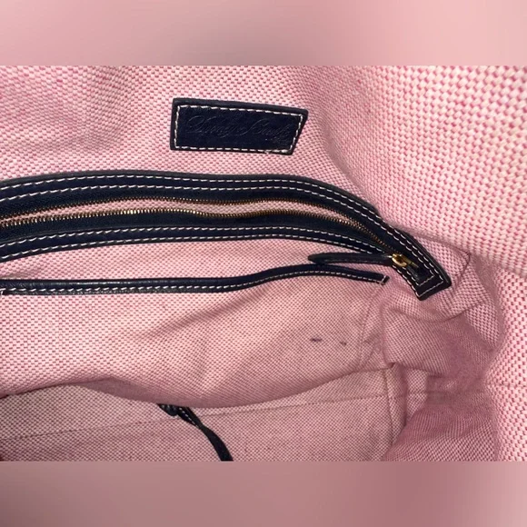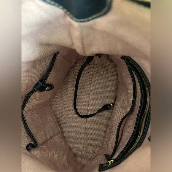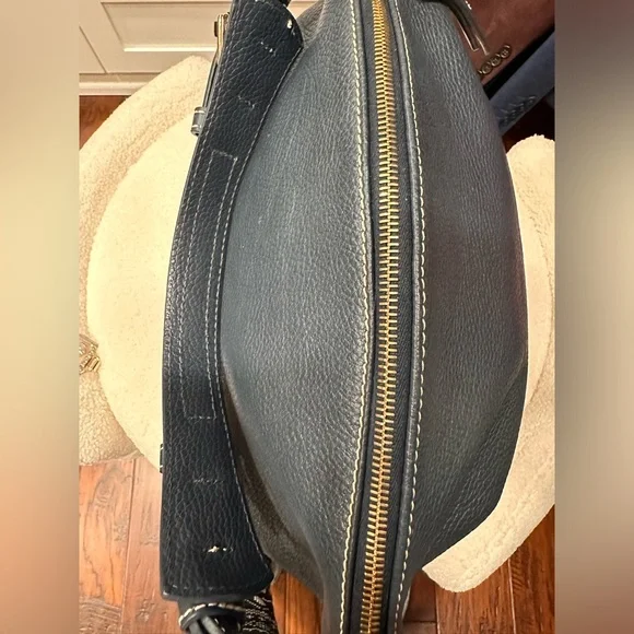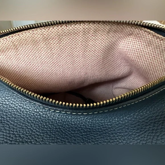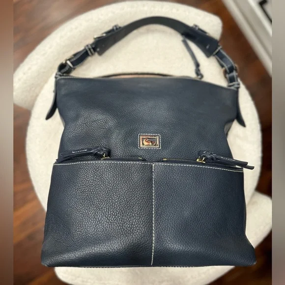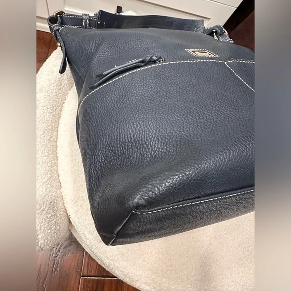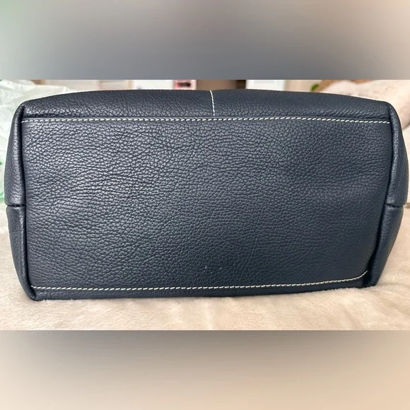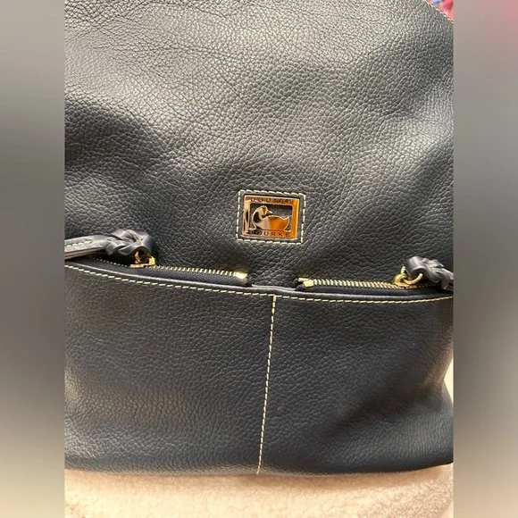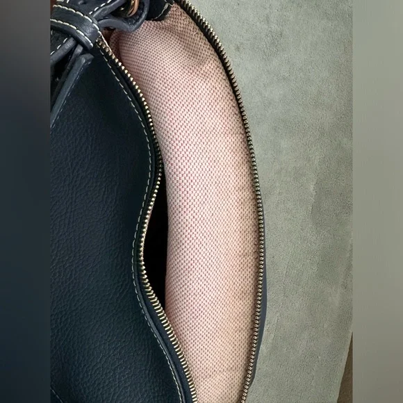 Dooney & Bourke Dillen MD Zipper Pocket SakNavy with white stitching, gold hardware.Approximate dimensions 12 x 12 x 5 inches.Adjustable shoulder strap drop 10.5 inches.Features two outside zip pockets, one inside zip pocket, one cell phone pocket, inside key hook. Pink-ish lining.Meant to be worn slouched.Fabulous leather look and feel!Please see pictures for condition. Outside leather shows truly minimal signs of wear (barely anything at the corners). White stitching is still white.Will include storage bag.