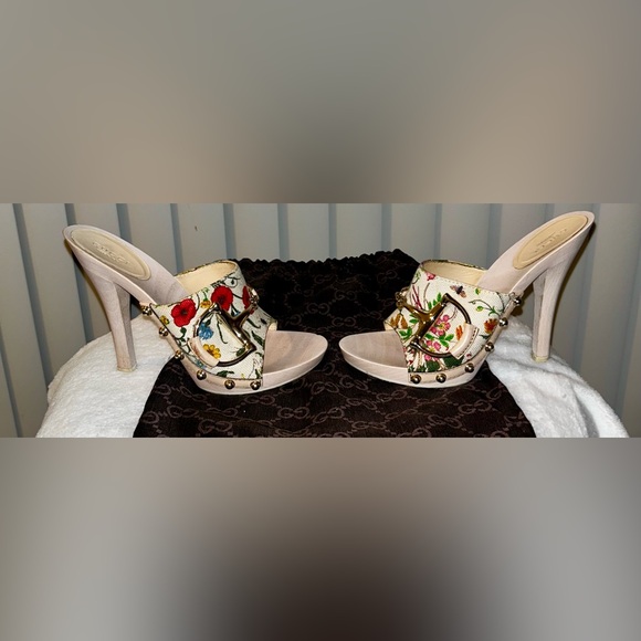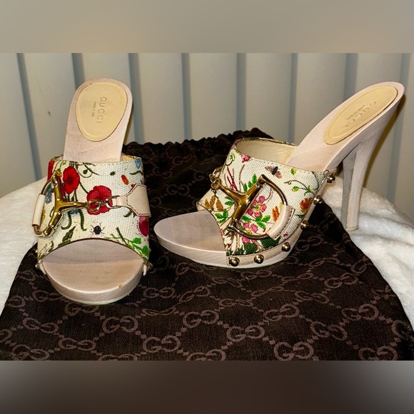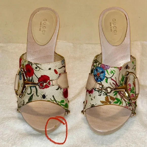 Vintage Floral Print Wooden Heels Sandals, size 36, 5in heel. good condition, authentic. Normal wear ,there is a few scuffs on the leather part of both shoes as shown in pictures...