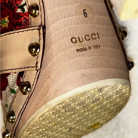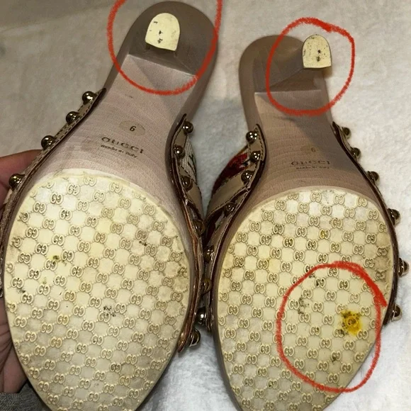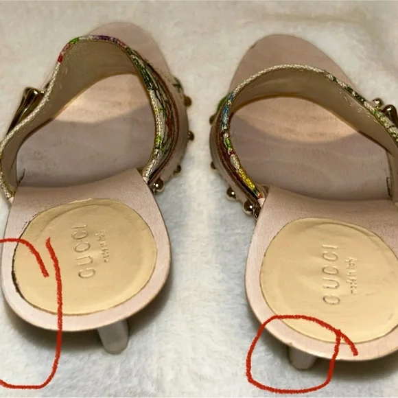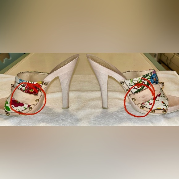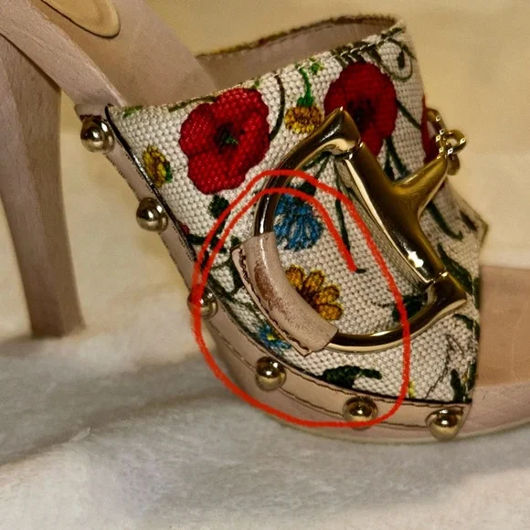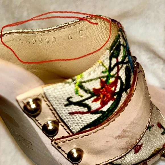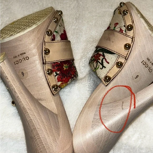 Vintage Floral Print Wooden Heels Sandals, size 36, 5in heel. good condition, authentic. Normal wear ,there is a few scuffs on the leather part of both shoes as shown in pictures ( it is circled in red ) there’s a small chip at the toe of the shoe , a small scuff on the heel , the bottoms are a little stained as shown in pictures. There’s a tiny chip at the top of the heel of the shoe . All flaws are shown in pictures.( circled in red) . These are 20 years old , no tears or stains on the fabric but I did get a lot of use at one point in my life. Bought at the store in Chicago. These are truly fun shoes . Comes with original box, dust bag .