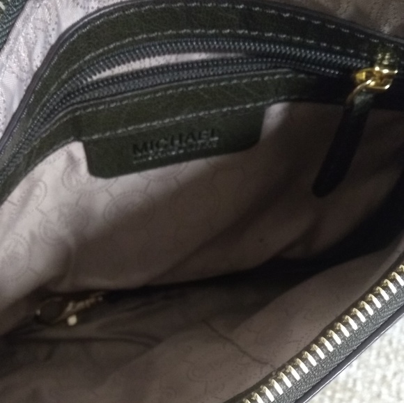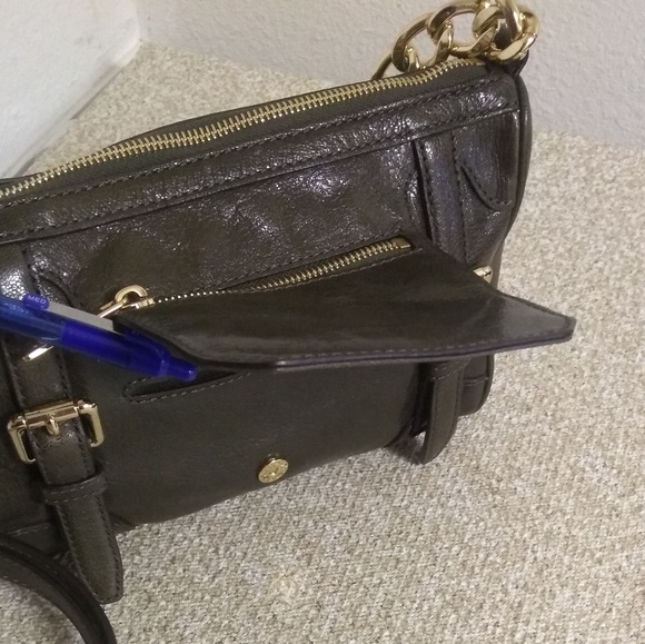 Preowned Michael Michael Kors Russet olive leather buckle accent crossbody bag. In excellent condition. Adjustable strap drops 26".