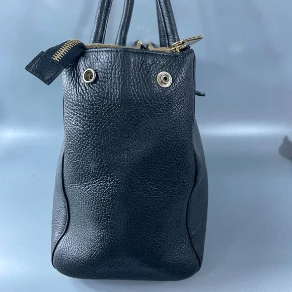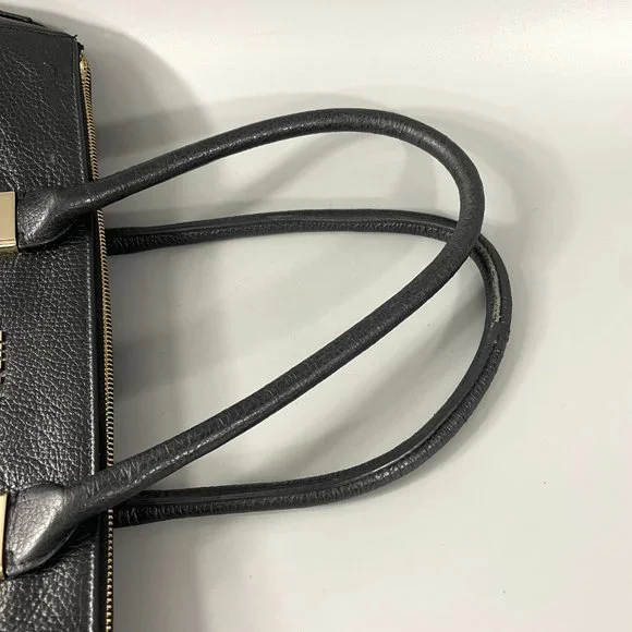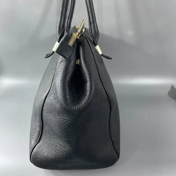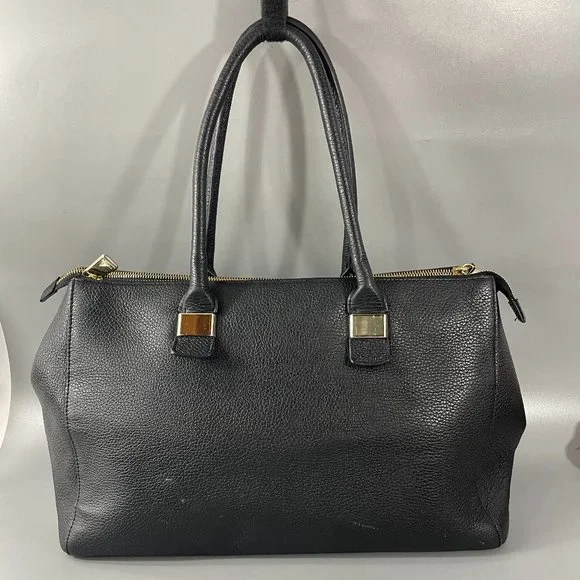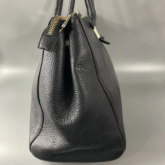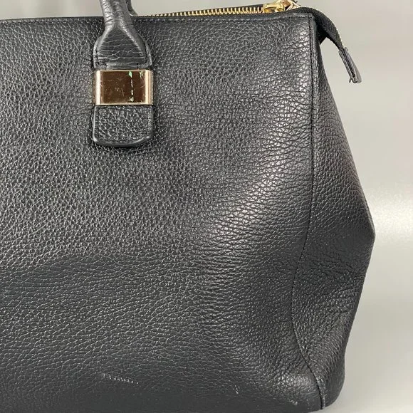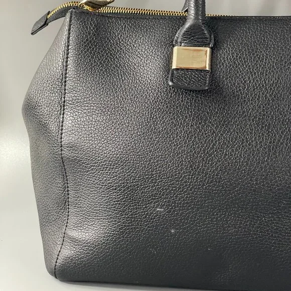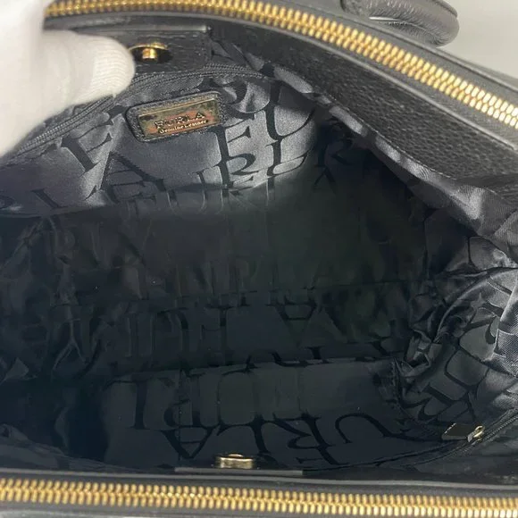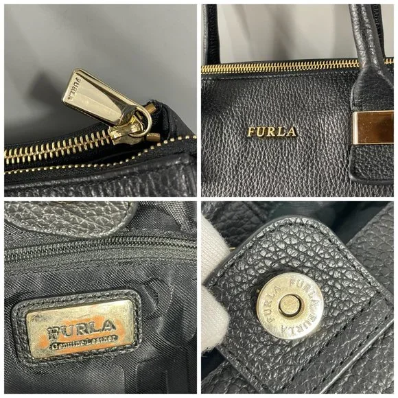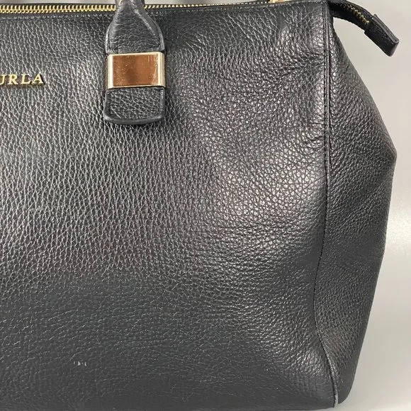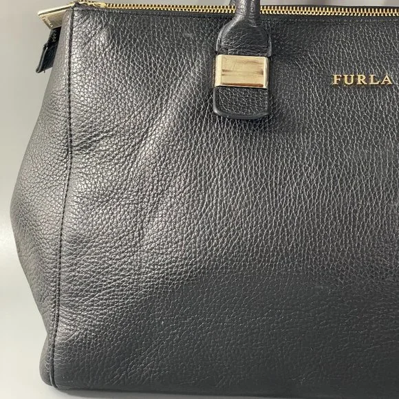 Furla Black Leather Shoulder BagGold-tone hardwareDouble rolled top handles, drop approx. 9´´Fully lined3 compartments: 2 zippered compartments and 1 zip closure one with 2 zip pockets and 2 small slide-in pocketsSnaps on the sides to adjust opening wideness Dimensions: approx. 14´´ W x 10.25´´ H x 5.5´´ D (max)It is in good pre-owned condition with wearNeither new nor in mint ocnditionPlease see all the posted pictures for detailsAsk any questions before purchasing.L2