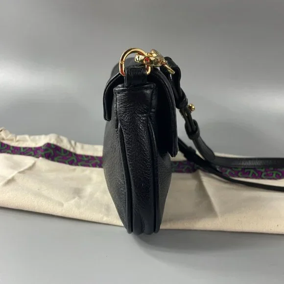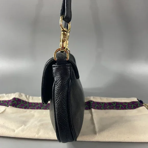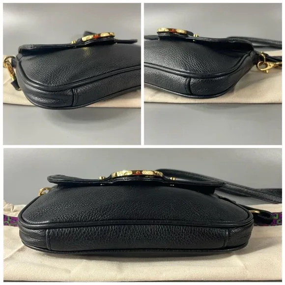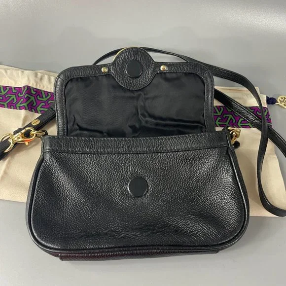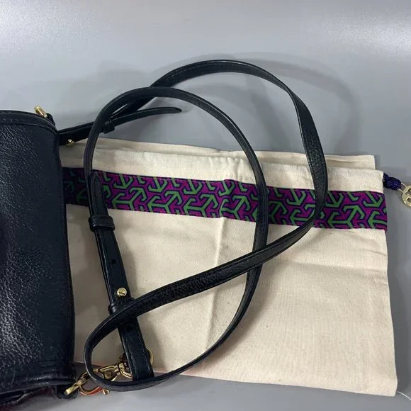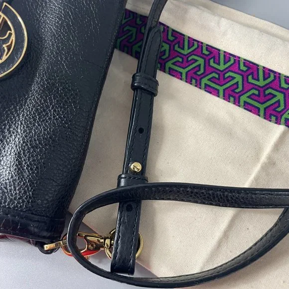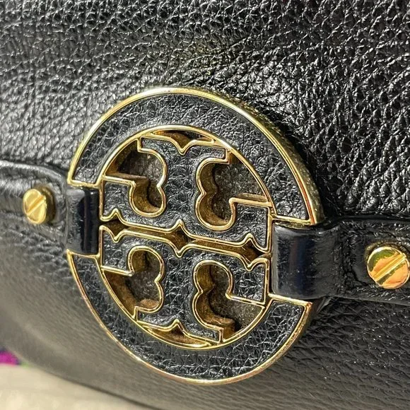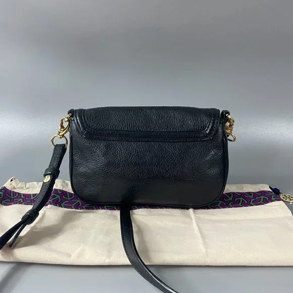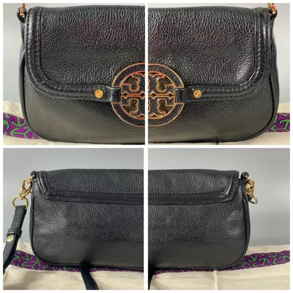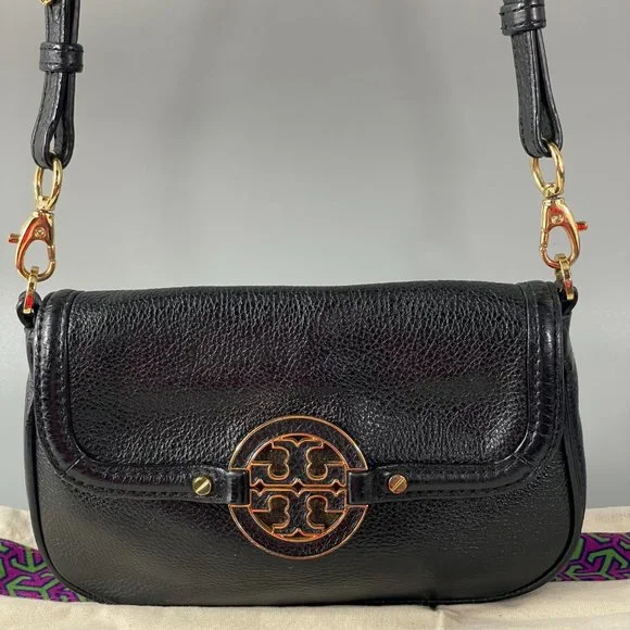 Tory Burch Black Leather Amanda Crossbody BagThree built-in card slotsPebbled leather with tonal topstitchingGold-tone hardwareRemovable, adjustable leather shoulder strap, 22" drop. Double-"T" medallion adorns flap topJacquard liningSoftly rounded, slim designApprox 5.25"H x 8.5"W x 1"DDust bag includedIt is still in good pre-owned condition with wearPlease see all the posted pictures for detailsAsk any questions before purchasing