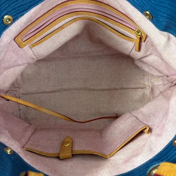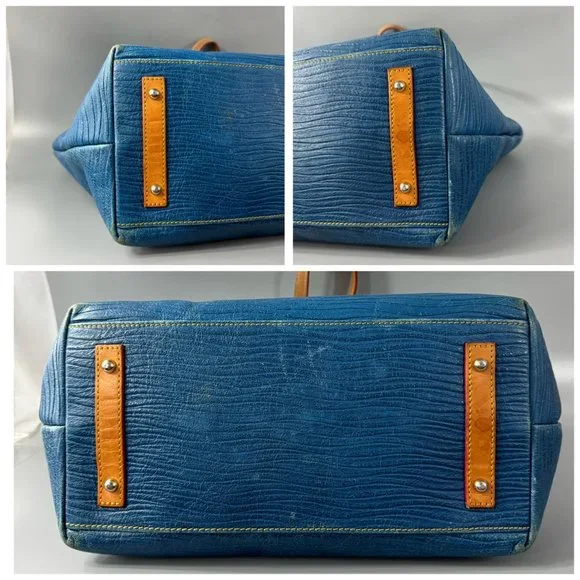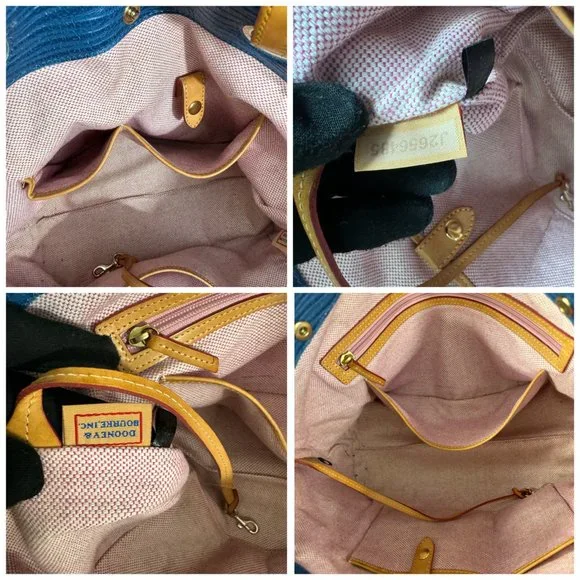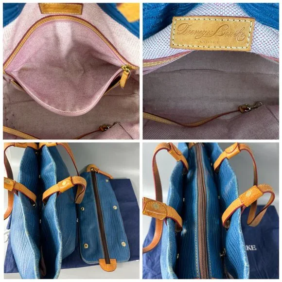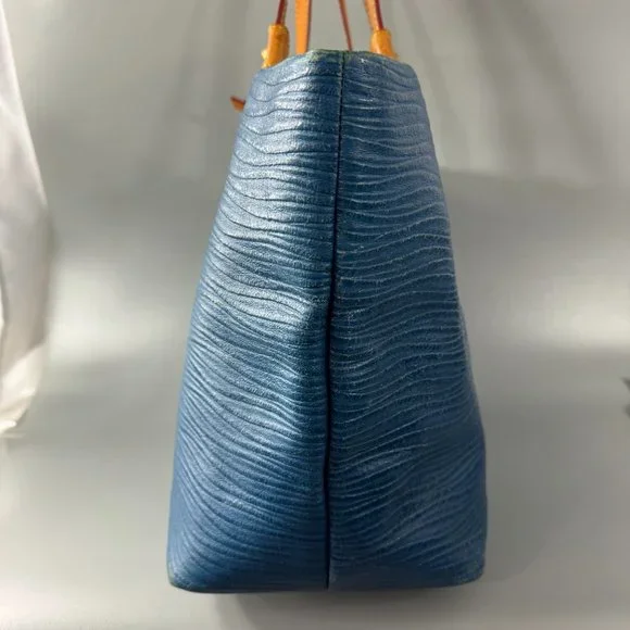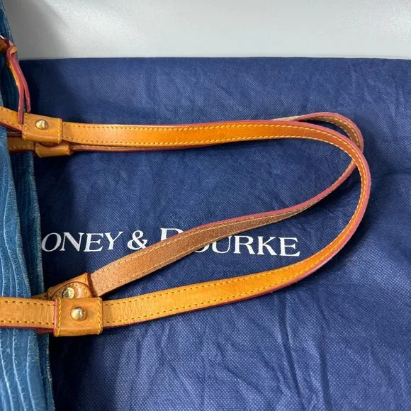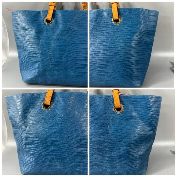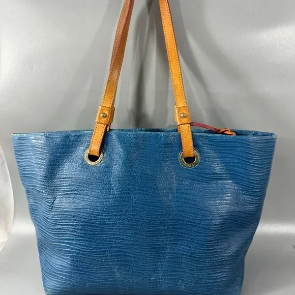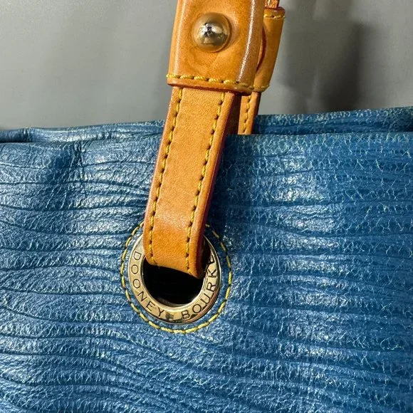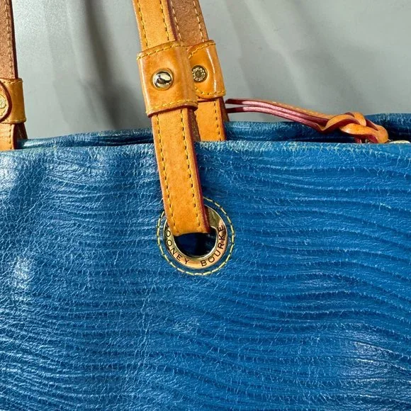 Dooney & Bourke #J2782511 Blue Leather Large Tote/Shopping Bag/Shoulder PurseGold-tone hardware and 4 feet on the exterior bottom for protectionWavy blue textured pattern and yellow stitch with double tan leather straps, drop approx. 10´´Fully lined with minimal smudges and a few pen marksOne Inner Zip Pocket, 2 Inner Slip Pockets, Key Clip, Very RoomyDetachable Zipper Attachment for a More Open Tote Feature! (see pic 11)Overall Length about 15 1/2": 13" Bottom-18" Top, 10.5" H x 6.5" DMinor discoloration on the exterior leather, esp. on the edgesComes with a Dooney & Bourke dust bagIt is still in good vintage pre-owned condition with wear and scratches.Neither new nor in mint conditionPlease see all the posted pictures for detailsAsk any questions before purchasing.M&B