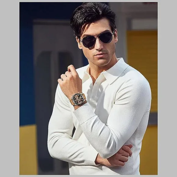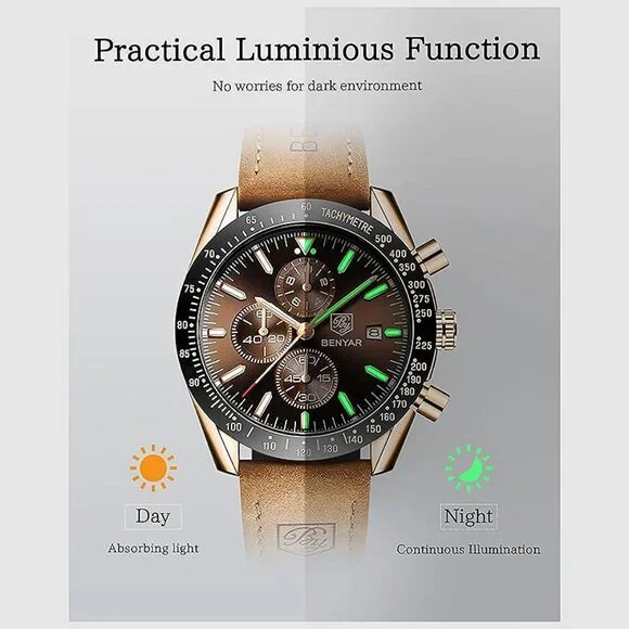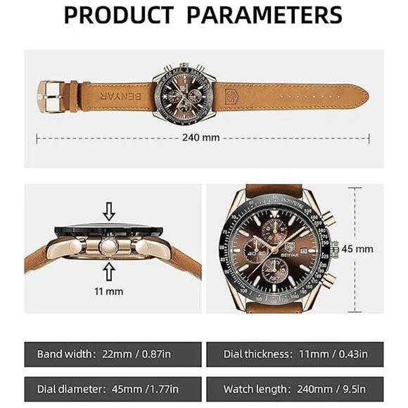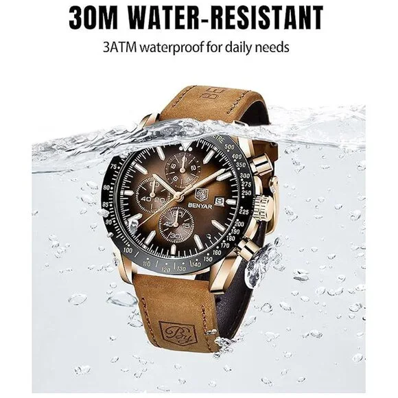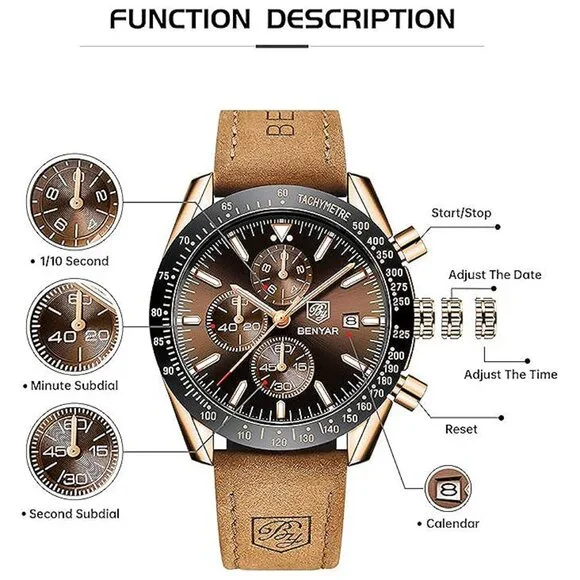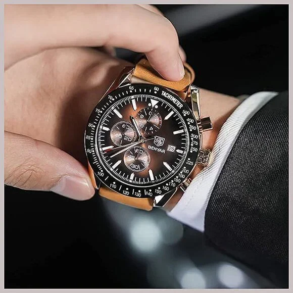 * ⌚【UNIQUE ELEGANT DESIGN】This is a stylish and classic design man watch. 45MM beautiful and exquisite big face with three functional subdials and date display, tachymeter numerals on the bezel, with a fashion brown leather strap, Quality quartz analog movement and battery, provide precise time and perfectly match any of your outfits, Benyar analog wrist watch embodies the pursuit of fashion and quality that redefines time! * ⌚【QUALITY & COMFORTABLE】100% high quality imported quartz movement to provide high stability and accurate timing. 304 steel case with mineral glass, which greatly improves the wear resistance and scratch resistance. The brown leather strap watch for men not only looks elegant and stylish, but is also comfortable and soft to wear. This men´s wrist watches will stand the test of style and last a lifetime if properly maintained. * ⌚【CHRONOGRAPH & WATERPROOF】Multifunctional sub-dial can be used as timers (Second, Minute and Hour Chronographs). BENYAR´s waterproof chronograph watches for men is waterproof 30M/3ATM, can withstand sweat, accidental rain or water splash (Showering, swimming, immersion in water is not recommended). After absorbing enough light energy to have a certain glow-in-the-dark effect in dark environments. It is a multifunctional leather watches for men. * ⌚【IDEAL GIFT】Fashion and casual watches suitable for men and youth, perfect for everyday wear and any occasion, Providing accurate timekeeping and becomes a fashion statement for you
