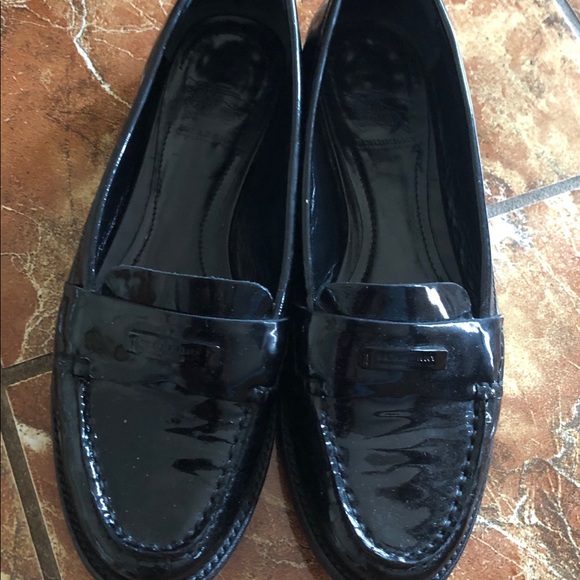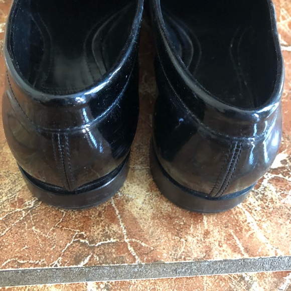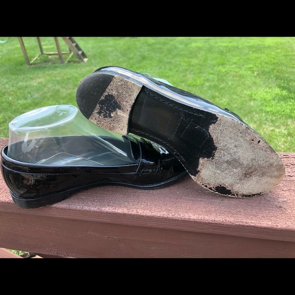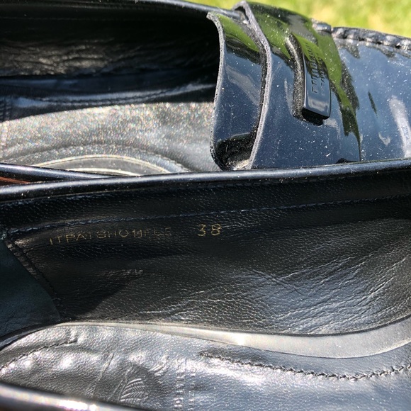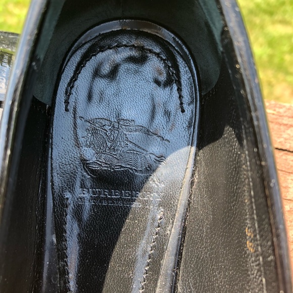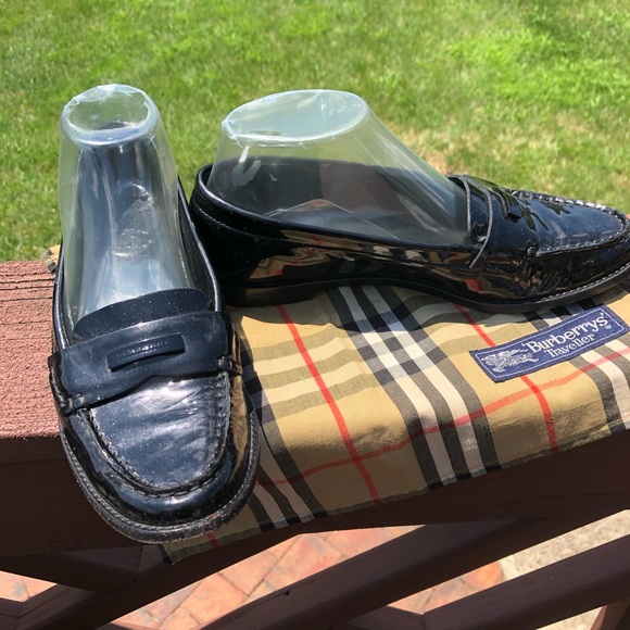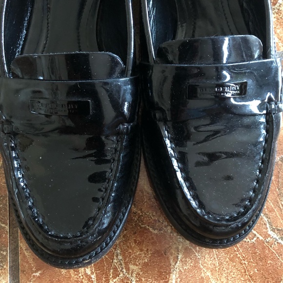 Vintage Burberry Loafer Shoes in patent leather black; size, 8. Preloved in good condition with signs of wear on the bottom, scuffs and stray markings.