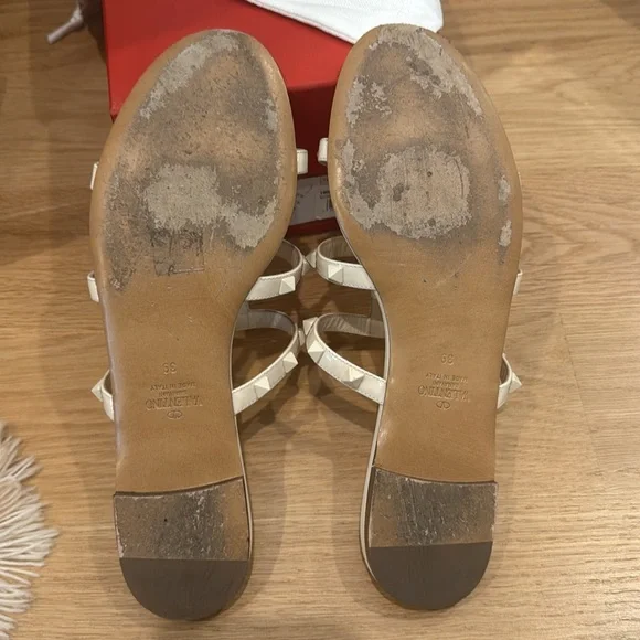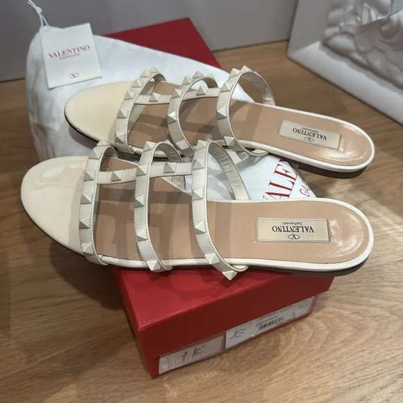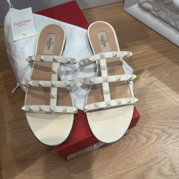 Valentino Garavani rock stud slide in cream patent leather Size 39. Minimally worn.Size 39 and fits like 8/8.5(selling them because I need half size larger) includes original box, original dust bag original insert card form of authenticity and additional stud in case one needs replacement.DETAILSValentino Garavani patent leather sandals with tonal signature Rockstuds.0.2" flat heel.Open toe.T-strap vamp.Slide style.Leather lining and sole.Made in Italy.Italian designer Valentino Garavani held his first significant show in 1962 at Florence’s Pitti Palace, an appropriate setting for his opulent collection. Gorgeous lace, feminine details, gossamer-like chiffon, and a vibrant shade of red were Valentino´s hallmarks. Today, Pierpaolo Piccioli honors the house´s heritage while adding more modern touch