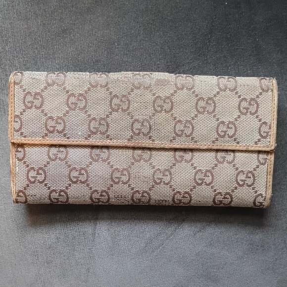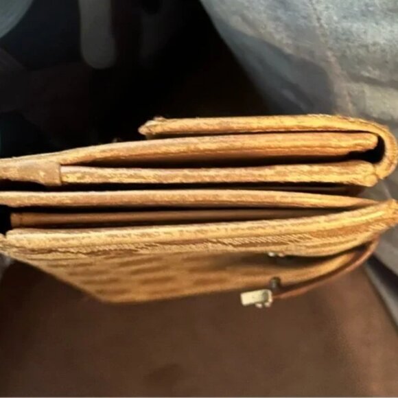 Vintage Monogram Leather Trim WalletGood vintage condition, but shows some wear (scratches on leather, wear on corners, some wear to interior lining, snap does not close tightly on outside snap)Measures approximately 7.5" X 4" X 0.5"Please examine photos carefully to see the flaws