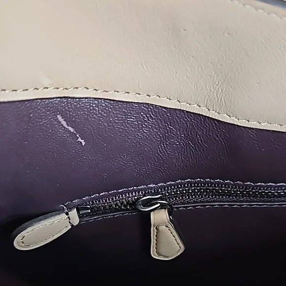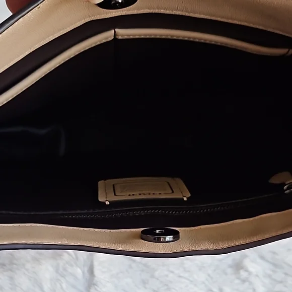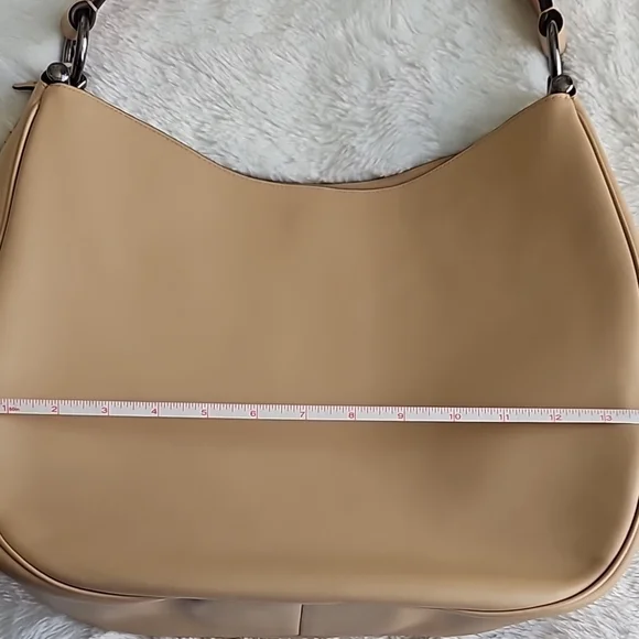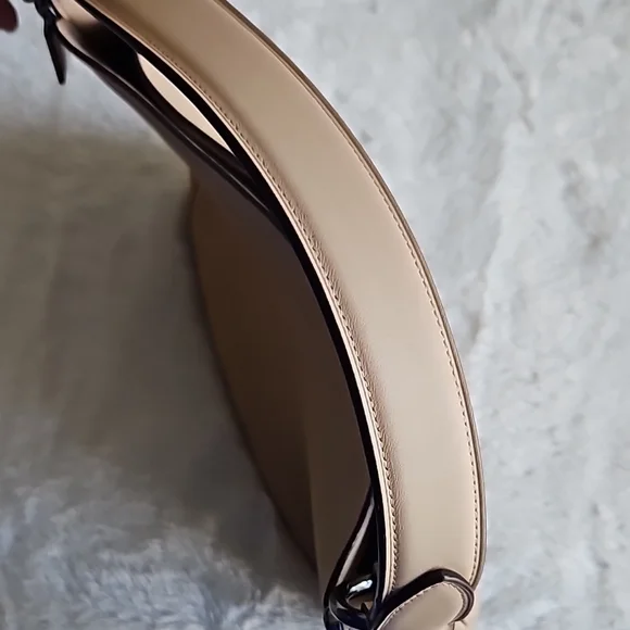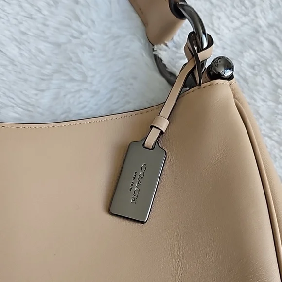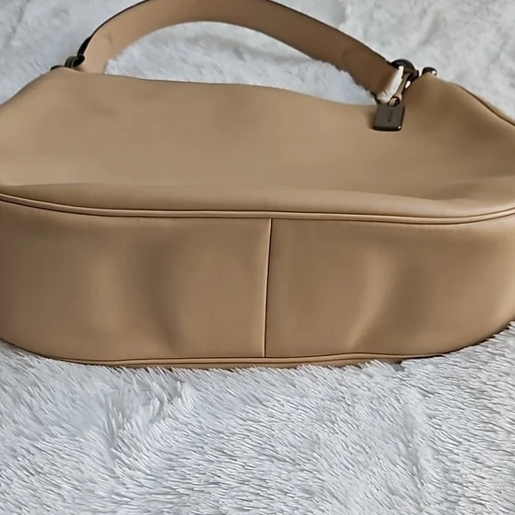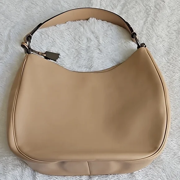 Elevate your style with the Coach Beige Leather Shoulder Bag. This elegant accessory is perfect for any occasion, offering both sophistication and practicality. Crafted from high-quality leather, it ensures durability and timeless appeal. The neutral beige color complements any outfit, making it a versatile addition to your wardrobe.Beautiful Coach Mae Hobo.very good used condition. last picture shows flaw inside.does not include cross body strap.