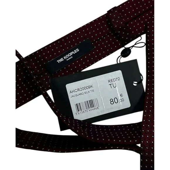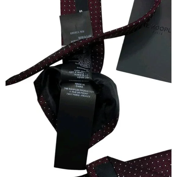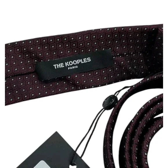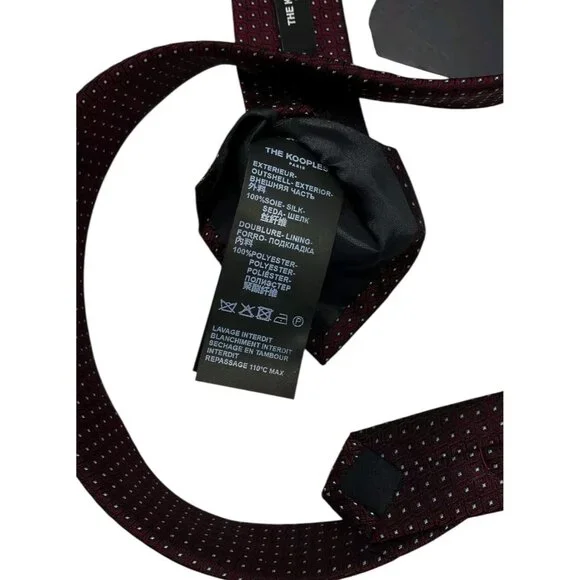 Brand : THE KOOPLESCountry Of Manufacture : ChinaType & Style : Men´s Slim TieColor & Pattern : Burgundy GeometricMaterial : Silk Size : RegularMeasurements : L 60" W 1.8" Condition : New With TagWelcome to S.I.R. LUXURY StoreAll our items are geniune and authentic.The color may vary slightly due to computer or phone screens.We will do our best to ship your item fast and carefully.If for any reason you are not satisfied with the item received, please write us before leaving bad feedback and we will resolve it immediately.Just give us a fair chance and we promise we can make you Happy, your satisfaction is our priority.You can also visit our store and take a look at our collection of items for men and women posted daily.Please do it and save us.Thank you.