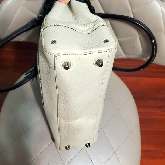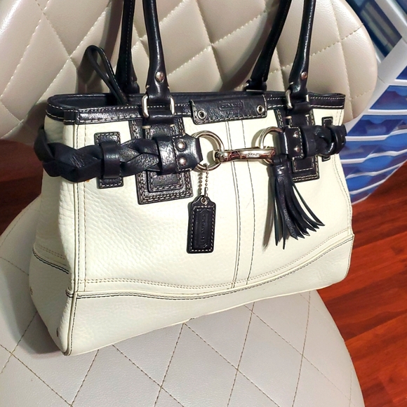 Coach Hampton White And Black Leather Carryall Braid Accent HandbagChic satchel with black and white leather. Features braided accents and tassel detail. Perfect for stylish...