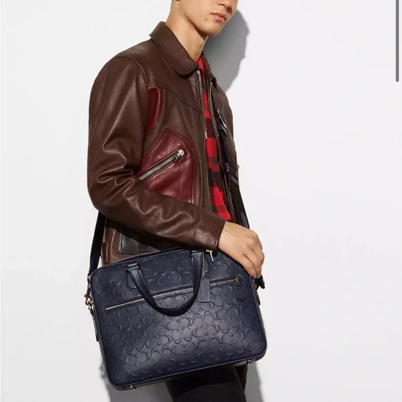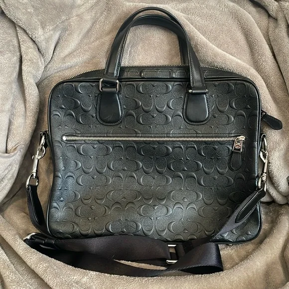 Coach bag in fantastic condition. It is super versatile and really is gender neutral. It can be used as a daily bag, laptop bag, briefcase…. Signature crossgrain leatherInside zip, cell phone and multifunction pocketsInside sleeve with secure tab for a 13" laptopZip closure, fabric liningHandles with 4 3/4" dropOutside zip pocketDetachable strap with 53 1/4" drop for shoulder or crossbody wear14 1/4" (L) x 11" (H) x 2" (W)Style No. 25516Questions? Leave a comment below!