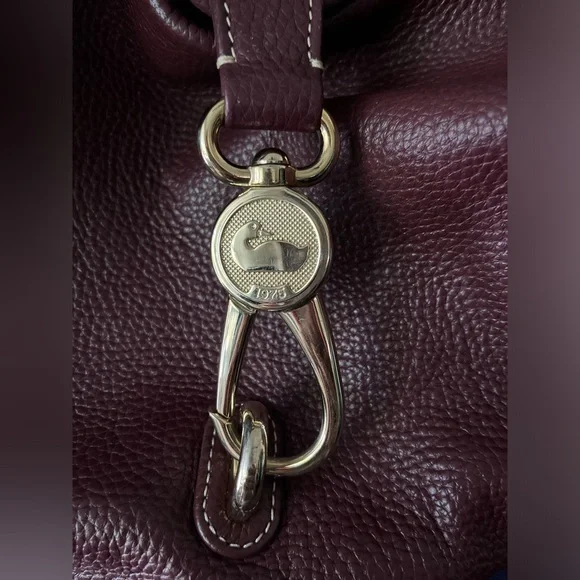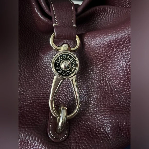 Gently used wine colored Dooney & Bourke Logo Lock Sac with Coin PurseThere are a few imperfections on the bottom where it has rubbed as noted in the video and one other spot noted in the picture.All sales final.No returns. Smoke free home. >Signature double-sided Dooney & Bourke logo lock closure.>Handle drop length: 8">H 10.5" x W 5" x L 10">1 lb 14 oz>Designed in Norwalk, CT by Peter Dooney>One inside zip pocket. Two inside pockets>Cell phone pocket>Inside key hook>Lined>Feet