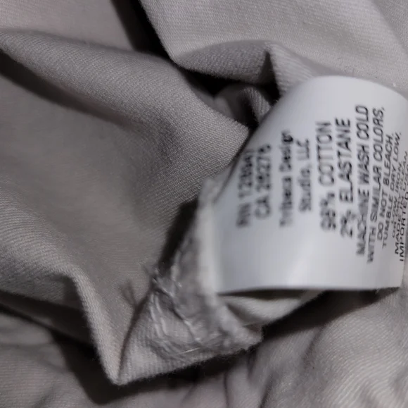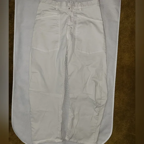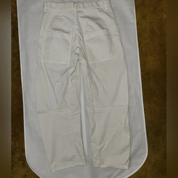 High-rise relaxed-fit pant. Uniquely curved silhouette. Easy gently tapered legs. Fabric: cotton blendCropped profile with shaping darts at kneesHook-and-eye closure at waist, zip flyNote: The Shon is roomy. If you want it to sit higher on the waist we recommend ordering a size down.Looks like eggshell but shade not mentioned