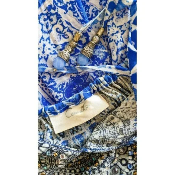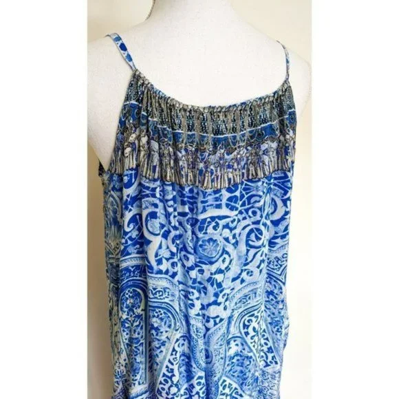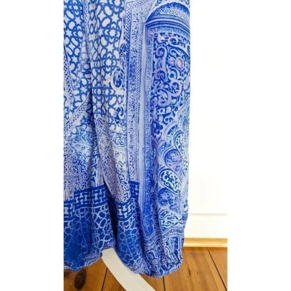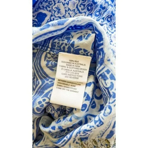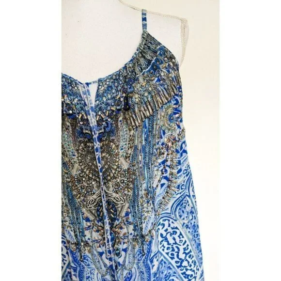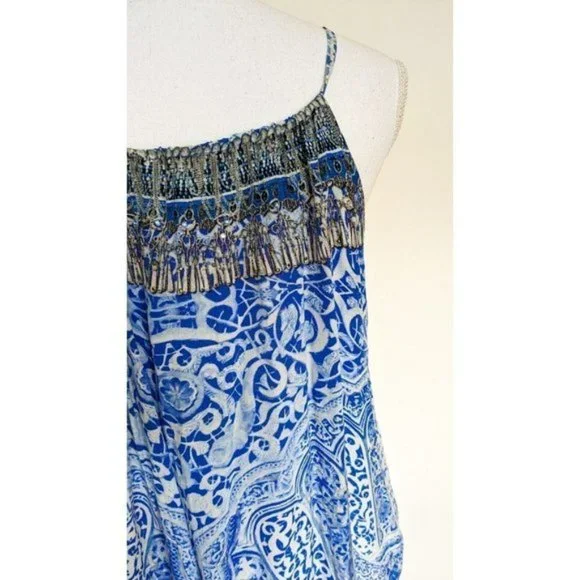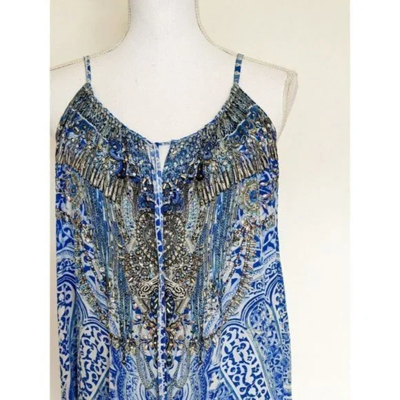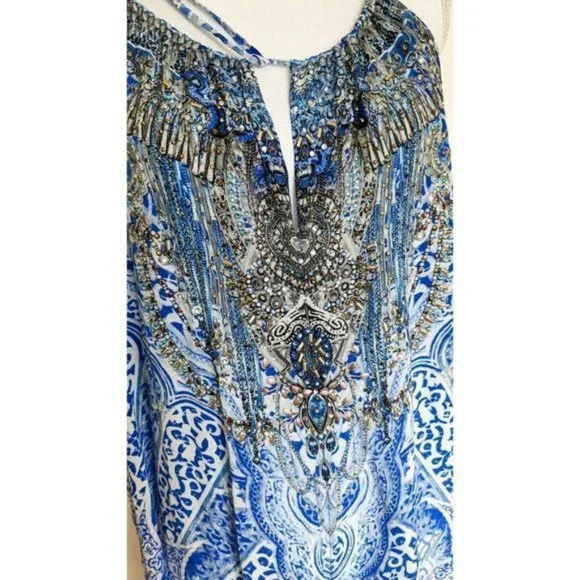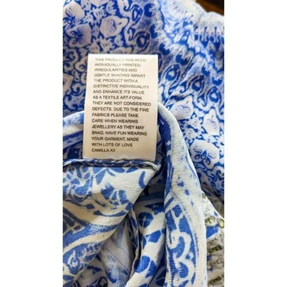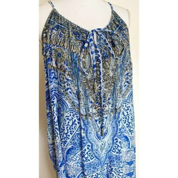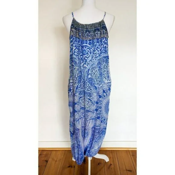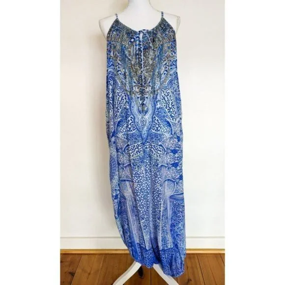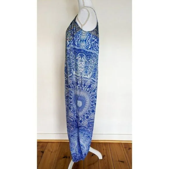 Camilla Blue Phosphor Full Length Silk Jumpsuit.A chic hypnotic jumpsuit designed for free movement. Crafted with soft CAMILLA white-based silk this floaty one sized jumpsuit billows with even the smallest of movement and features a shoestring strap with tie front detail elasticated cuffs and is finished with hand applied CAMILLA crystals.- Printed jumpsuit- Bohemian style- Crystal embellishment- Tie front detail- Elasticated cuff- Shoestring strapFABRICATION: 100% SILKSIZE RANGE: O/S- one size fits most?? All items sent in recycled rsable or compostable packaging.Please check out my other items happy to bundle to save on shipping.Please familiarize yourself with the brand sizing measurements available on request.Open to offers but prompt payment appreciated.I ship anywhere in the world ing Sendle and stralia Post with all packages marked thority to Leave. Please let me know at checkout if you need a signature on delivery for your parcel.All items in excellent preloved condition unless otherwise stated ??
