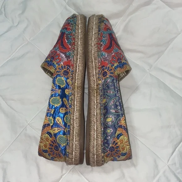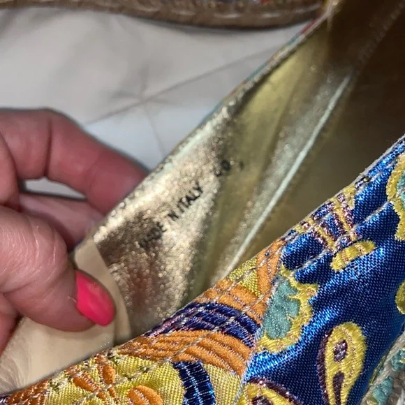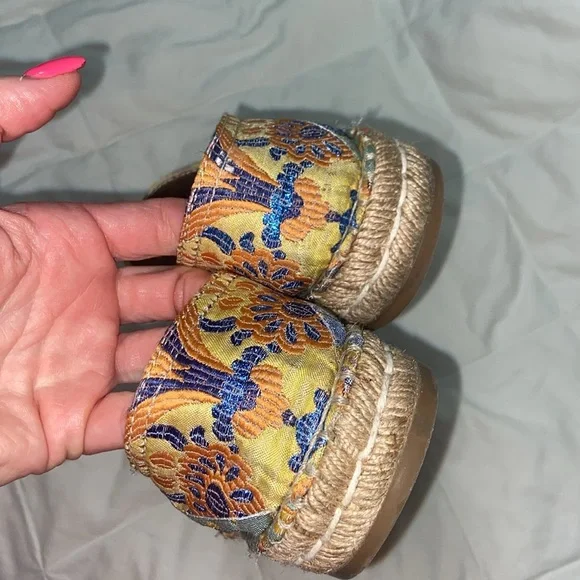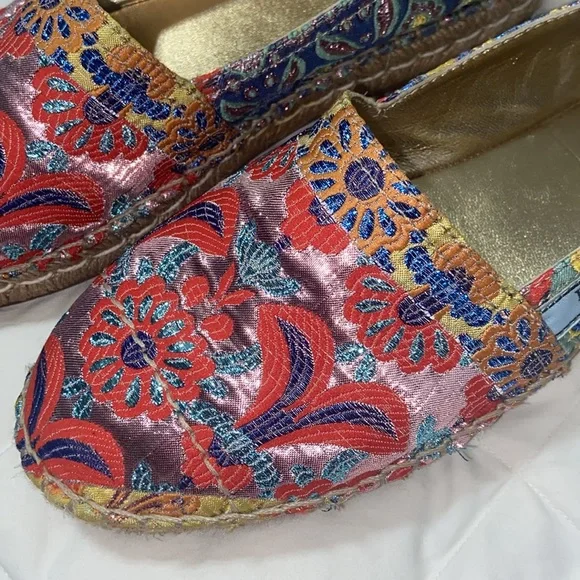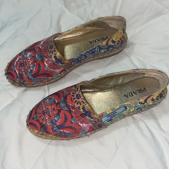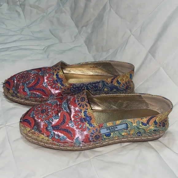 HTF RARE Prada jute espadrille.Jacquard metallic threading.Floral design. Leather lined. Excellent condition except small separation of bottom and shoe at toe bottoms see last...