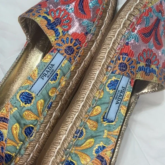 HTF RARE Prada jute espadrille.Jacquard metallic threading.Floral design. Leather lined. Excellent condition except small separation of bottom and shoe at toe bottoms see last pix. smoke free home. Sz 40 made in Italy. Perfect summer espadrille gorgeous shoes worn once.