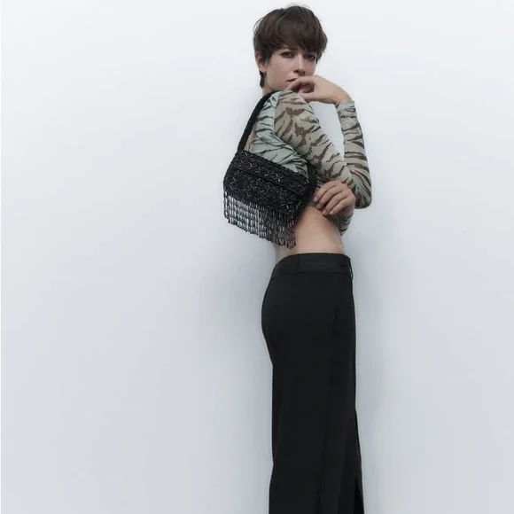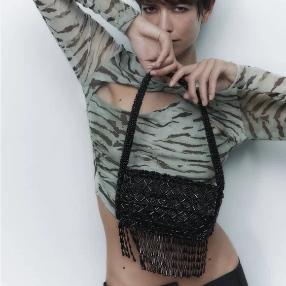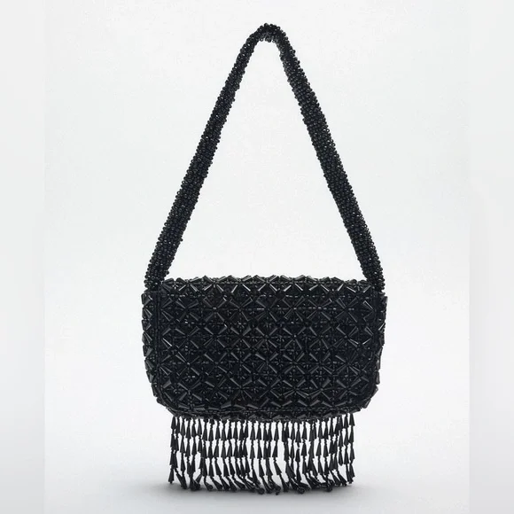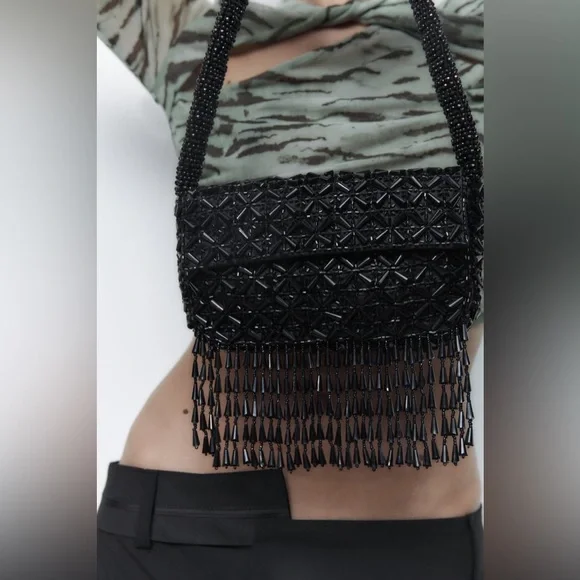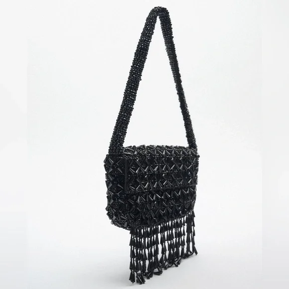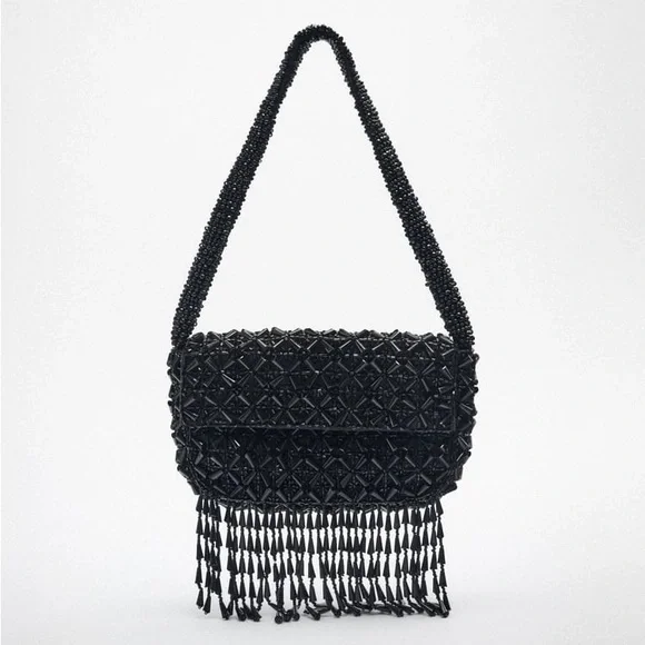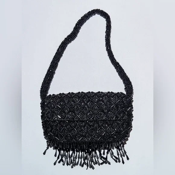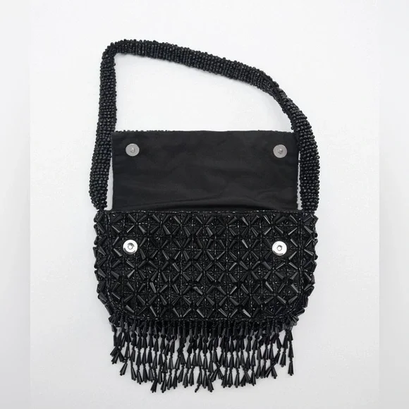 Shoulder bag with beading and fringe. Magnetic closure at flap.Height x Length x Width: 5.5 x 8.3 x 1.6 inches (14 x 21 x 4 cm)Color: BlackGold version available in another listing.