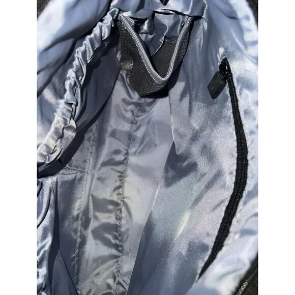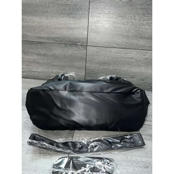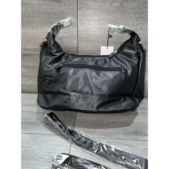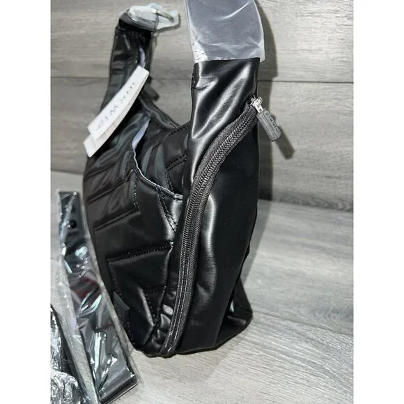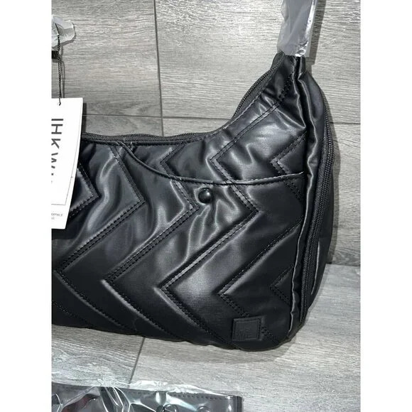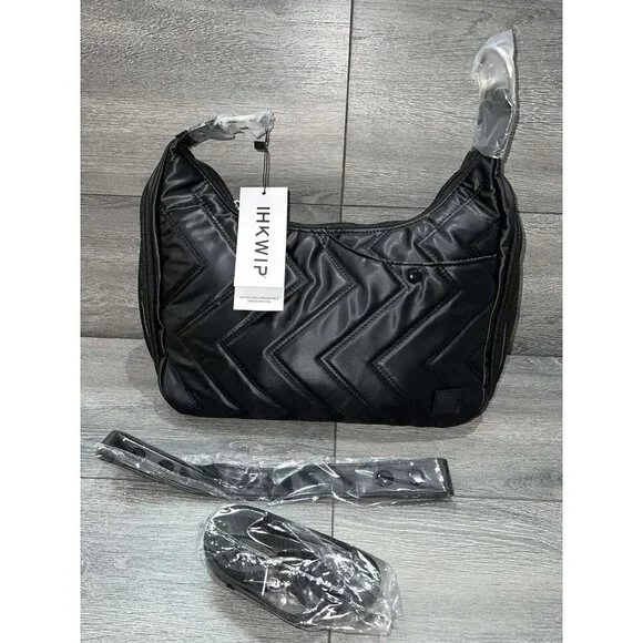 IHKWIP The Zig Zag Quilted Convertible Shoulder Bag Metallic BlackFrom IHKWIP.• Not all cards contain RFID contactless technology - this product only helps protect cards with RFID contactless technology• Zip closure, zig-zag quilting pattern, magnetic snap front pocket with key clip, two gusseted side zip compartments, rear zip pockets, adjustable shoulder strap, removeable crossbody strap• Eight RFID card slots, elastic loops• Measures approximately 14"L x 4.5"W x 10.5"H with a 11" strap drop; weighs 14 oz• Body 100% nylon; lining 100% recycled polyester• Imported