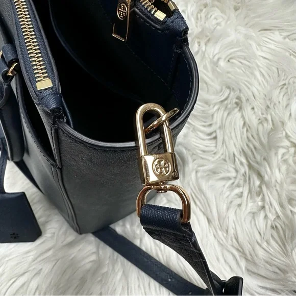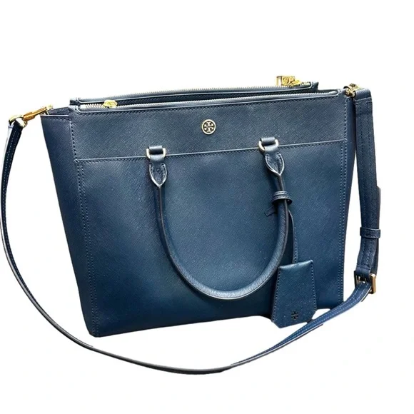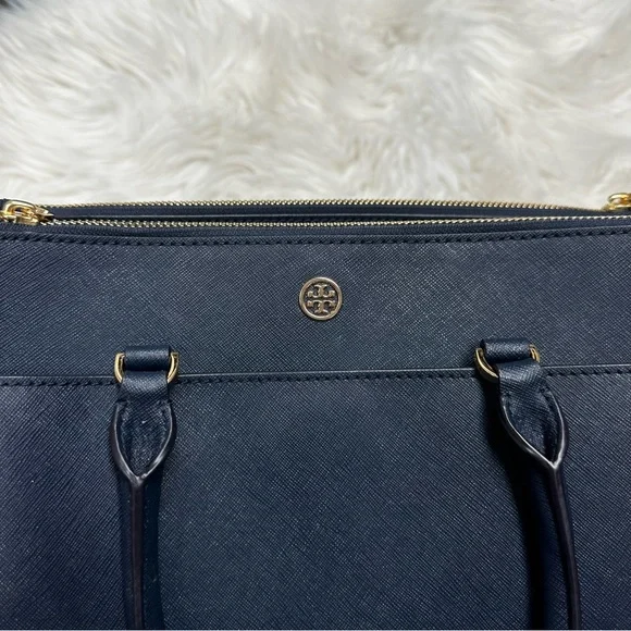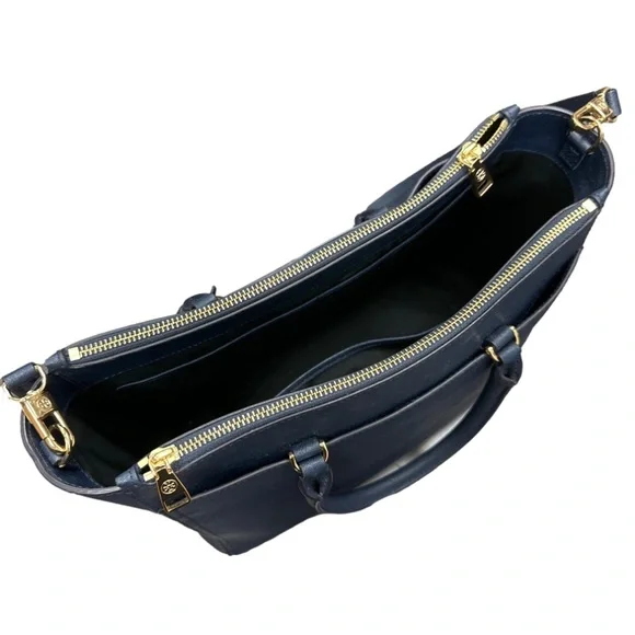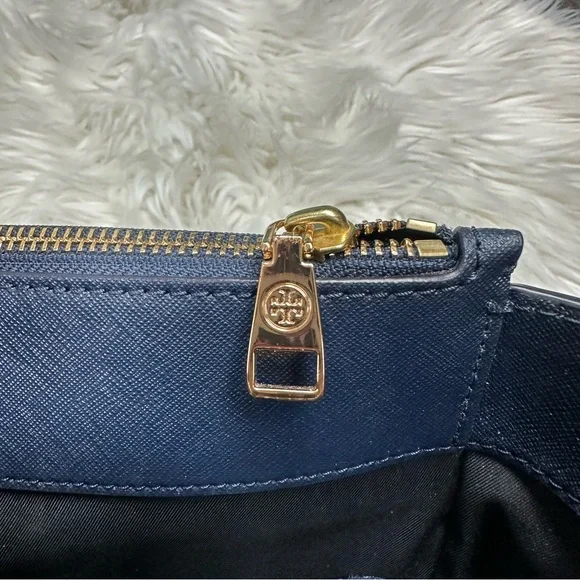 Tory Burch Robinson navy double zip tote. Double zip, two exterior compartments, gold gear throughout, In the middle compartment you´ll find three compartments for sunglasses, cell phone or other goodies, detachable shoulder strap. LIKE NEW Condition.L=11"H= 8.5"W= 2" closed.