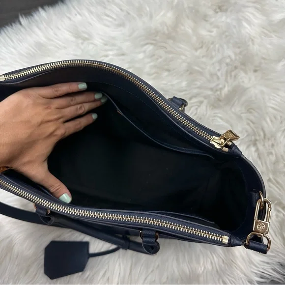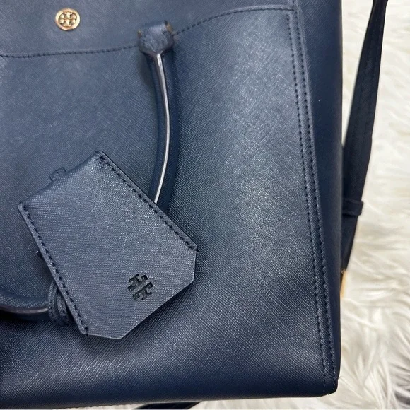 Tory Burch Robinson navy double zip tote. Double zip, two exterior compartments, gold gear throughout, In the middle compartment you´ll find three compartments for...