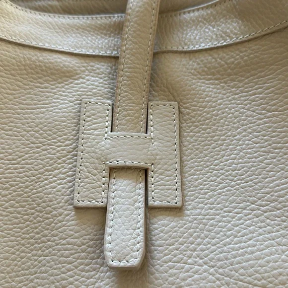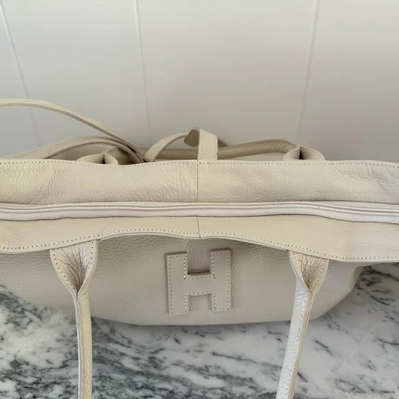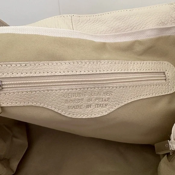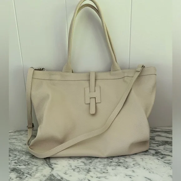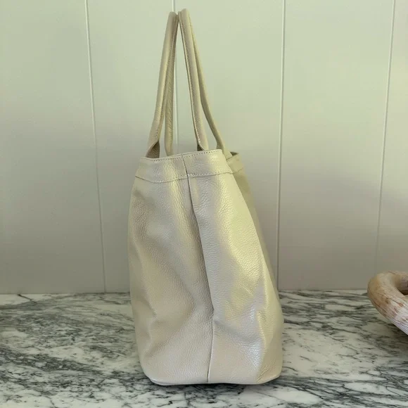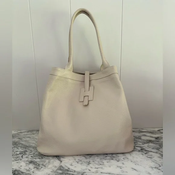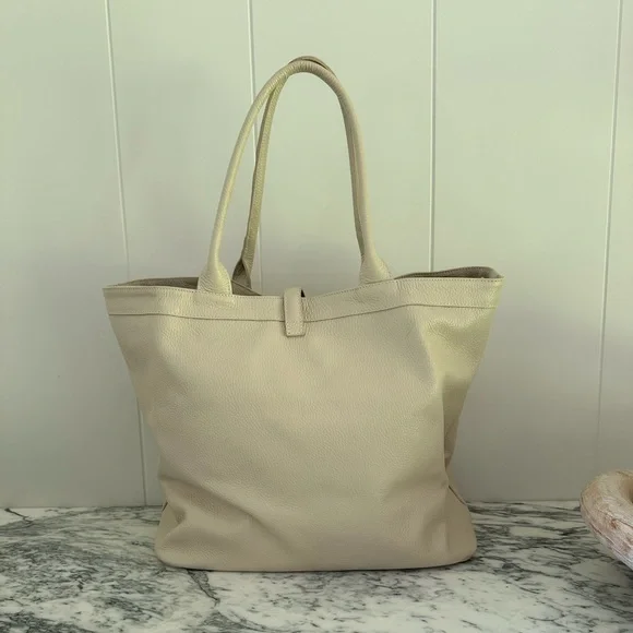 This cream and white tote bag combines elegance with practicality, featuring a structured design crafted from high-quality leather. Its spacious interior and minimalist aesthetic make it an ideal everyday carry-all. The bag´s sturdy double handles and central clasp detail add to its timeless appeal.