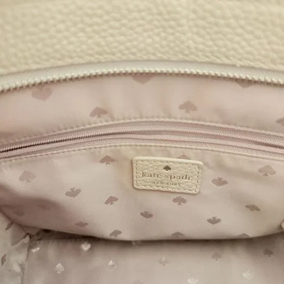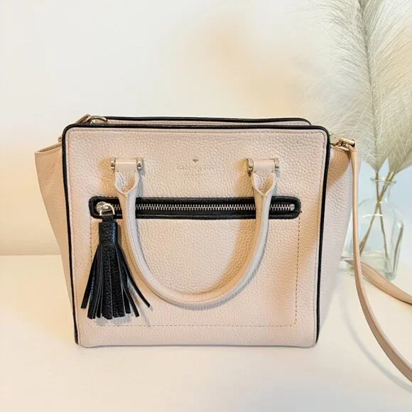 Condition: Gently Used – Excellent ConditionColor: Blush Pink with Black AccentsItem Details:- Elegant pebbled leather exterior in a chic blush pink with black trim- Gold-tone hardware with a stylish front zipper pocket and tassel detail- Dual top handles and an adjustable crossbody strap for versatile wear- Spacious interior with signature Kate Spade heart-print lining- Multiple interior pockets, including a zippered compartment for organization- Zippered top closure for secure storage- Perfect for everyday use, work, or elevating any outfitThis Kate Spade satchel is a timeless and elegant addition to any wardrobe! A great blend of functionality and style.All orders ship within 1-3 business days! Comes from a smoke-free home!