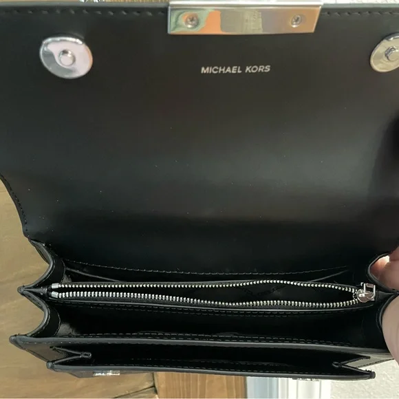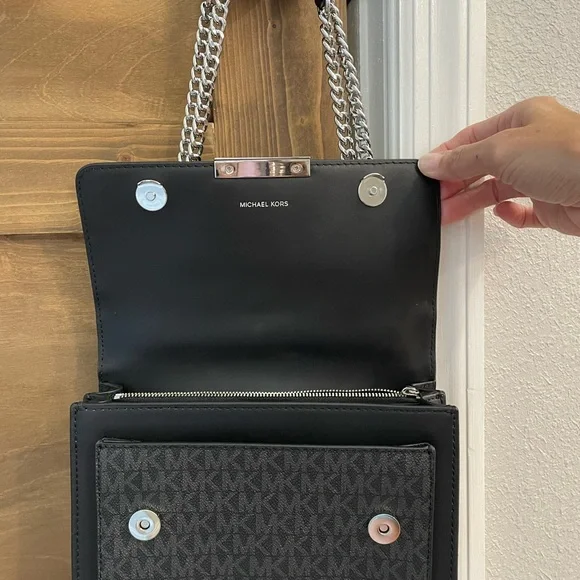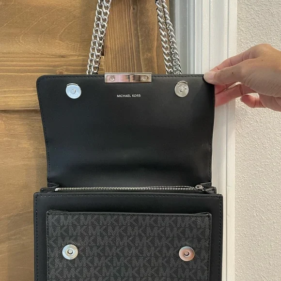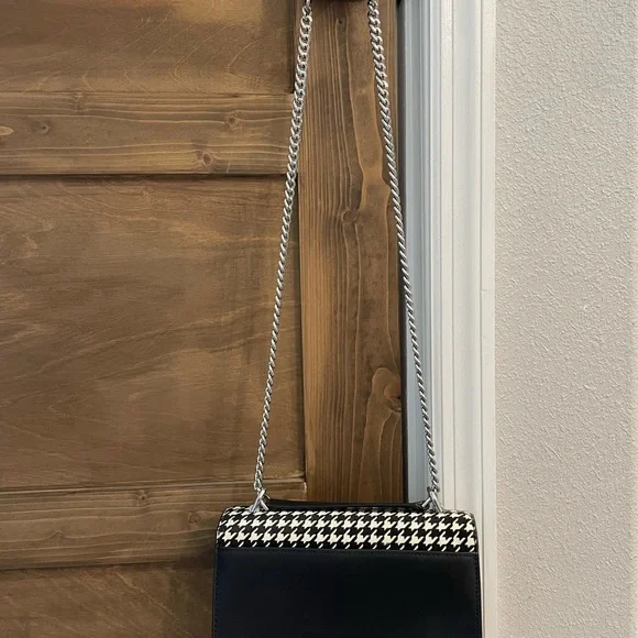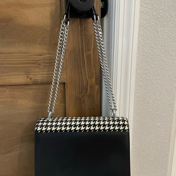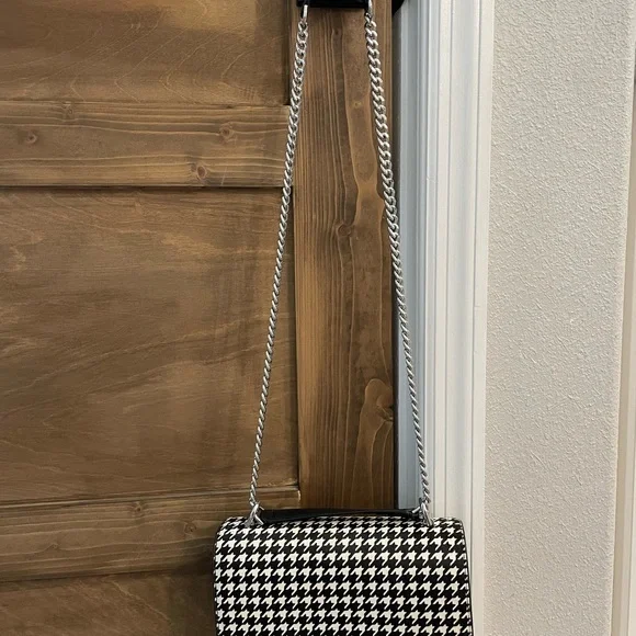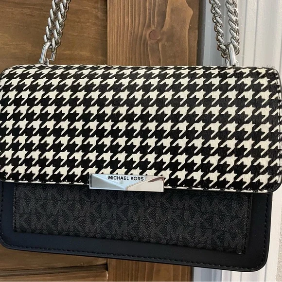 This Michael Kors shoulder bag features a striking black and white houndstooth pattern, offering a sophisticated and modern look. The silver chain straps add an elegant touch, making it a versatile accessory for any occasion. Crafted with a sturdy material, this bag is perfect for everyday use, providing both style and functionality.Used once. EUC. No marks or worn look.