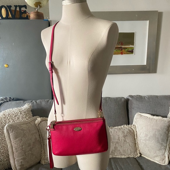 Coach crossbody/ clutch/ wristletbag in like new condition.It has an adjustable shoulder strap.Two zippered pockets for lots of storage space.The strap can be removed and bag used as a wristlet or clutch.No tears or rubs.Bag is in clean condition inside and out.10 inches width x 6 1/2 inches length