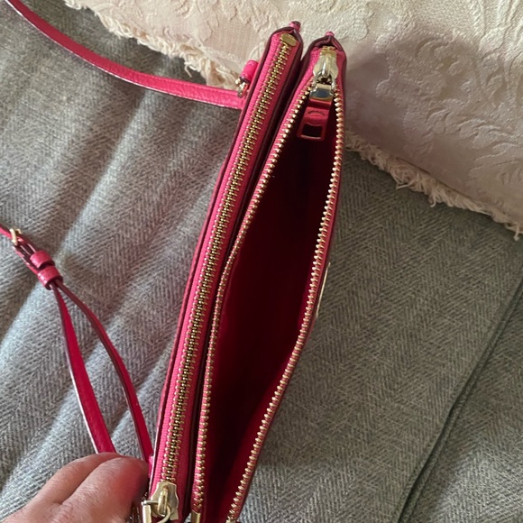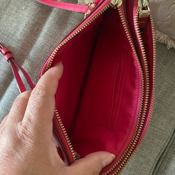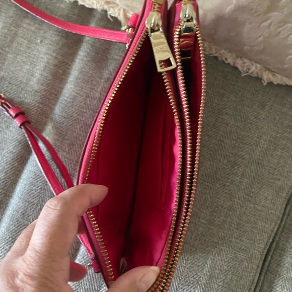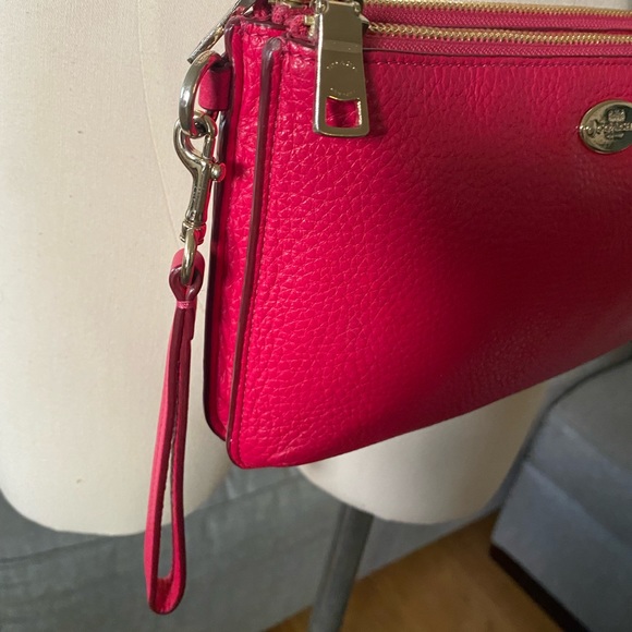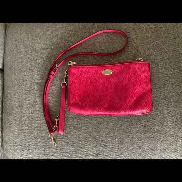 Coach crossbody/ clutch/ wristletbag in like new condition.It has an adjustable shoulder strap.Two zippered pockets for lots of storage space.The strap can be removed and bag used...