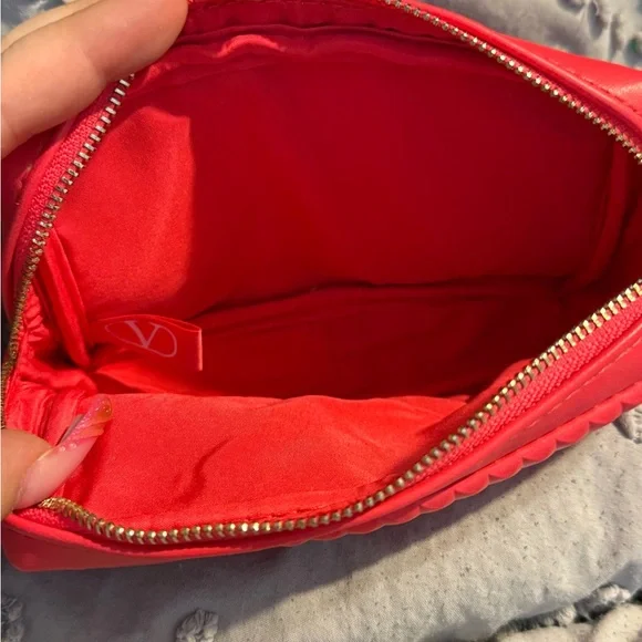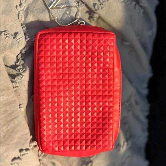 Sleek red cosmetic bag with textured design. Ideal for stylish storage.