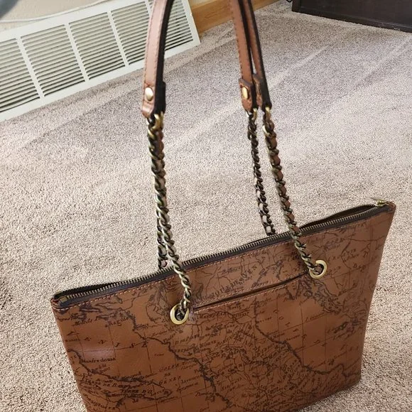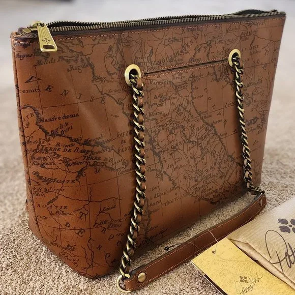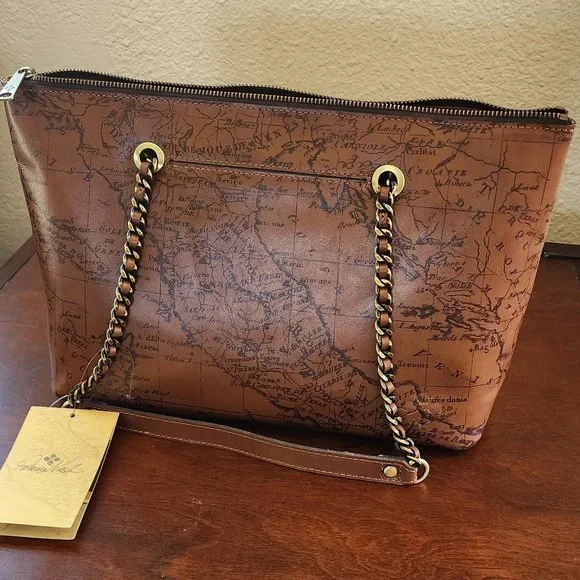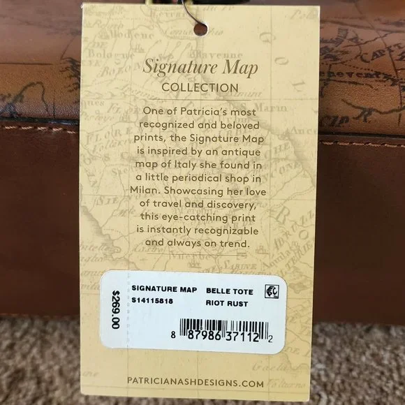 brand new with tagsOne of Patricia´s most recognized and beloved prints, the Signature Map is inspired by an antique map of Italy she found in a little periodical shop in Milan.The Belle Tote is handcrafted in luxurious leather in a gorgeous, iconic Signature Map Print and it´s a spacious, structured bag, taking you from workdays to nights out, to busy weekends.Details:100% full-grain leatherInterior: 1 zip pocket, 2 slip pockets; faux suede liningExterior: 2 slip pockets, deep embossed logo, burned edge finishZipper closureSignature brushed brass hardware, heavy handcrafted stitchingDimensions: 14-15"(W) x 9,5"(H) x 5"(D)Handle drop: 10 1/2" ( from the zipper)Color: Riot Rustcomes with the dust bag and the registration card