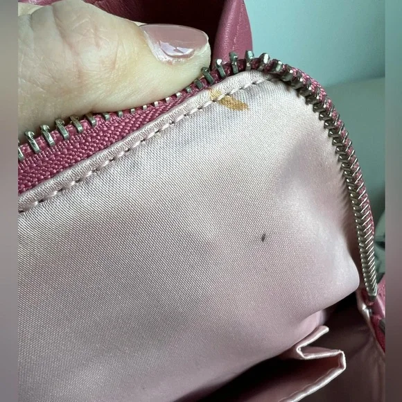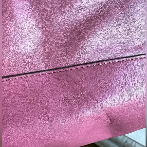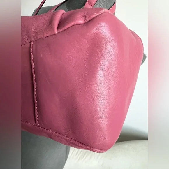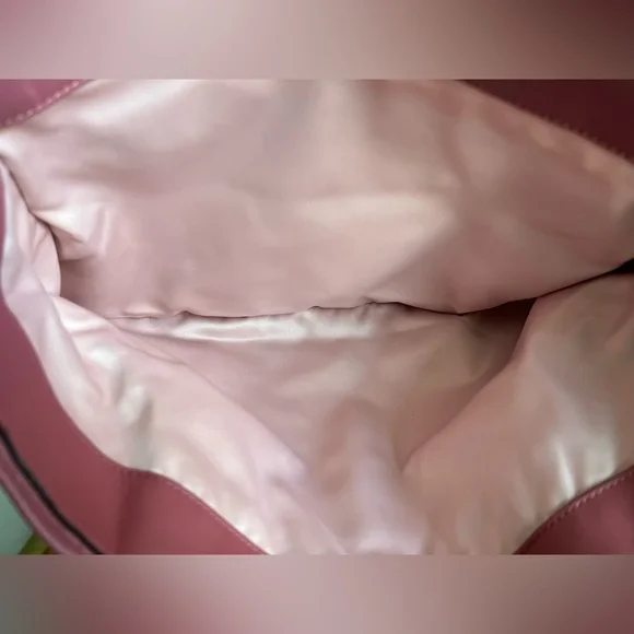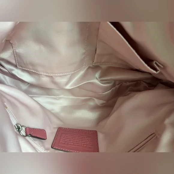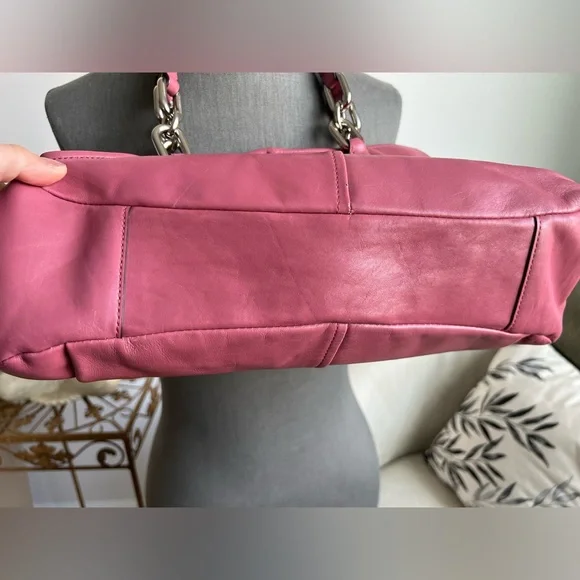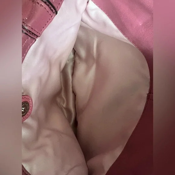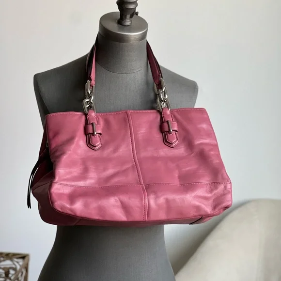 Coach Chelsea Jayden leather shoulder handbag in a mauve pink / dusty rose color with 4 satin lined compartments. Previously owned and in good vintage condition. See photos for slight imperfections/scuffs. Interior is nearly pristine, with a couple small stains that will likely come out with tide pen. Measures 14 1/2"by 4" by9 1/2. There is a 9" shoulder drop.This bag is not all that big from the out side but it opens up into 3 inside compartments that 2 can be securely closed with a magnetic strap when not being used and one is zippered. There is a front compartment that you can access from the outside that is also a magnetic closure.Clean, Pet free, Smoke free home